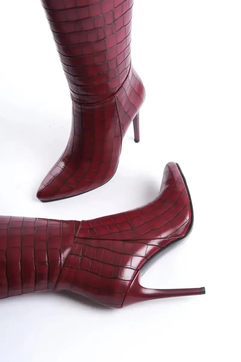 Women's Special Design Pointed Toe Half Zipper Thin High Heel Crocodile Boots-Bordo Croco, is a candidate to be an indispensable part of your wardrobe with Shoesers assurance! These special design boots will allow you to attract attention in any environment by combining both elegance and comfort. The burgundy crocodile pattern adds a unique touch to the boot, while the pointed toe design makes your feet look more elegant. The thin and high heel (10 cm and above) adds elegance to your posture, while you can take safe steps thanks to the special neolite sole material. Ideal for daily use, these boots add a sophisticated touch to your casual combinations. The orthopedic insole support ensures that your feet are comfortable all day long, while the woven fabric type helps your feet breathe. The 100% polyurethane material component guarantees the long life of the boot. Thanks to the half-zipper closure, you can easily put it on and take it off. This special piece from the Design collection is designed to reflect your unique style. Shoesers' special design boots are not just a shoe, but also a style statement. With the luxurious texture of the crocodile pattern, the elegance of the thin heel and the attractiveness of the burgundy color, you will add a different dimension to each of your combinations. Whether you are going to a special invitation or completing your daily elegance, these boots will accompany you. Let your style speak with these special design boots that offer comfort, elegance and quality together! Thanks to its compliance with Type 4 washing instructions, cleaning is also very practical. You can always look stylish and well-groomed with this special piece that should definitely be in your closet. Remember, style is hidden in the details and this boot will add a perfect touch to your style.