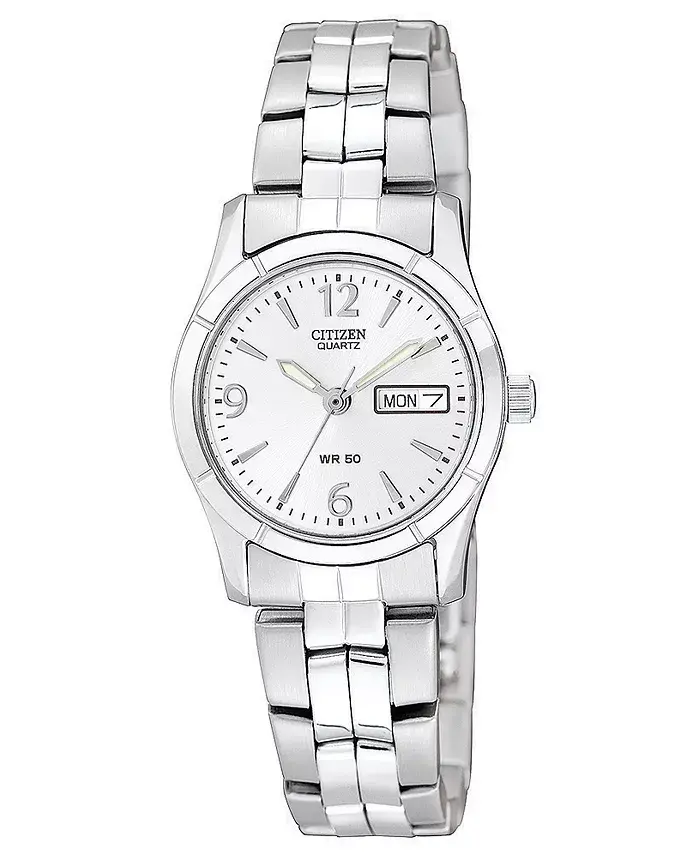 Capture timeless elegance with the Citizen Women's Stainless Steel Bracelet Watch 25mm EQ0540-57A. This elegant watch is designed to complement the style of the modern woman. Whether for everyday use or a special occasion, this watch will always highlight your elegance. With its minimalist design, high-quality materials and reliable mechanism, this watch not only tells the time, but also reflects your personal style.The EQ0540-57A model offers a striking look with its stainless steel bracelet and silver-tone dial. The tone-on-tone numerals and stick indices on the dial enhance readability while adding a sophisticated touch to the watch. The watch's Quartz movement guarantees precise and accurate timekeeping, while the 50-meter water resistance provides convenience for daily use.This watch is not only a stylish accessory, but also a practical tool. The day and date window at three o'clock makes your daily life easier. The stainless steel bracelet offers a secure and comfortable fit thanks to the folding clasp and push button. Citizen's belief in quality and reliability is supported by a 5-year limited manufacturer's warranty. You can earn an extra 1 year warranty by registering your watch with Citizen. This is an indication of Citizen's confidence in its products.Don't forget to secure your watch by signing up for the Modazone WorryNoMore® Jewelry & Watch Protection program. You can join this program by calling Customer Service or visiting any Modazone store within 30 days of the date of purchase. The EQ0540-57A is not just a watch, but also an investment and an expression of your style. Add this unique watch to your collection and carry your elegance with you at all times.
