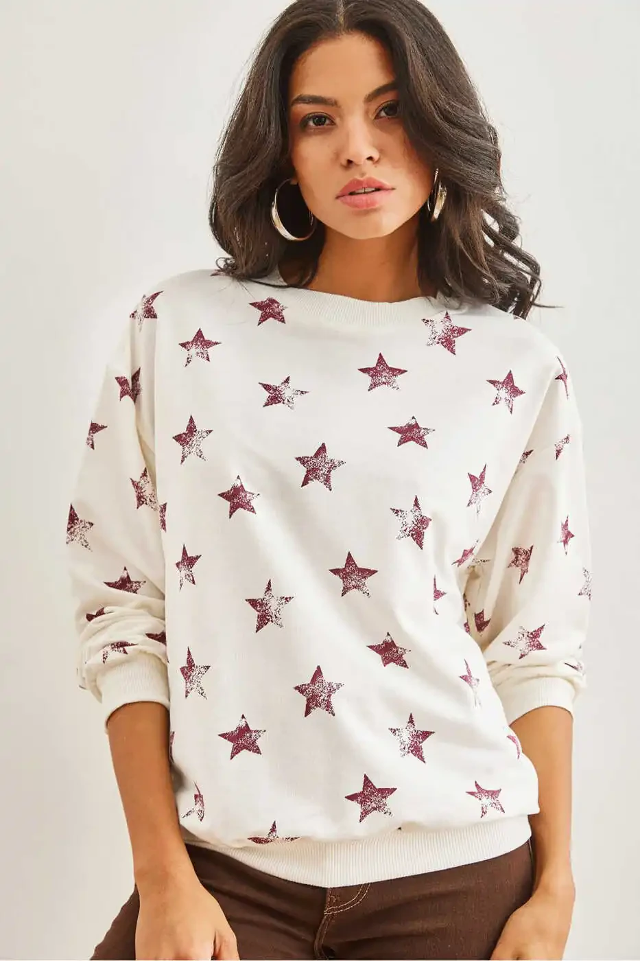 Women's Star Burgundy Basic Soft Texture Loose Sweatshirt | Style Meets Comfort