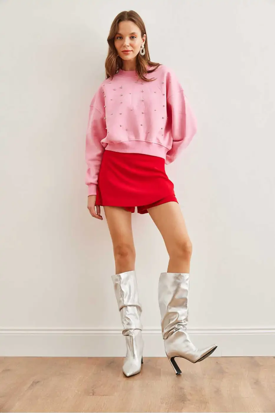 **Women's Candy Pink Pearl Detailed Thistle Crop Thick Sweatshirt SWT-19000663**