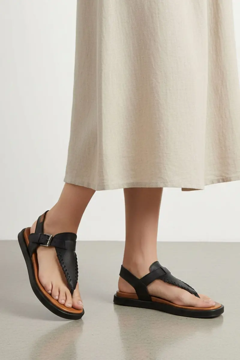 This sandal is the perfect choice for women who don't want to compromise on style in hot weather. Made with genuine leather, it ensures your feet stay comfortable. The black upper leather and coffee-colored thong combination offers a stylish look that will match any outfit. The ankle strap design ensures a perfect fit and provides the desired tightness.
