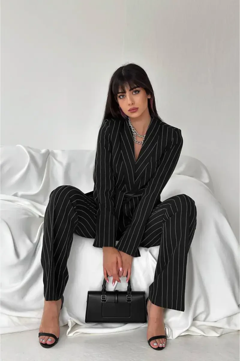 The Women's Tie-Waist Faux Pocket Belted Shawl Collar Blazer Jacket Straight Leg Stretch Pants Suit is an ideal option for women seeking a modern and stylish look. Combining classic and contemporary lines with its black striped pattern, this suit can be easily used both in business life and at special events. The tie detail and shawl collar of the blazer jacket create a feminine silhouette, while the faux pockets add a distinct touch of elegance. The belt detail emphasizes your waist for a more fitted appearance, while the straight leg stretch pants offer freedom of movement throughout the day. Offering long-lasting use thanks to its high-quality fabric, this suit will be an indispensable part of your wardrobe. You can choose this suit to make a statement with your style in the office, at meetings, dinner parties, or special events. The black striped design of the suit can be easily combined with different accessories and can adapt to any environment. Enjoy being both stylish and comfortable with this suit. Make this perfect choice to feel special and confident. This piece, which should definitely be in your wardrobe, will take your style to the next level. This suit, which offers both modern and classic details together, will win the appreciation of every woman. Designed for those who seek both style and comfort, this suit will ensure you always look well-groomed and stylish.