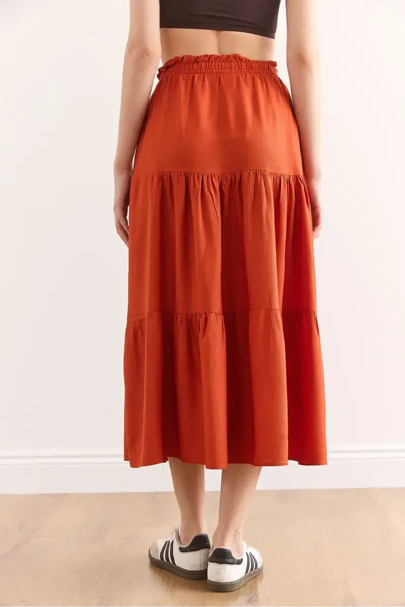 Women's Brick Tiered Midi Woven Skirt is a special design that combines elegance and comfort. This skirt is a candidate to be one of the indispensable pieces of your wardrobe. The warm and natural tone of brick color is suitable for all season use and allows you to create different combinations. The tiered structure adds movement and dynamism to the skirt, while the midi length highlights your elegance.Product DescriptionWomen's Brick Tiered Midi Woven Skirt is a piece that attracts attention with its modern and stylish design and can adapt to any environment. The skirt is made of high quality woven fabric. This makes it both durable and breathable for your skin. The brick color reflects the warmth of autumn and winter, while offering an energetic look in spring and summer. The tiered structure of the skirt creates a pleasant silhouette while you are moving and helps you create a unique style. The midi length is ideal for both daily use and special occasions. You can combine it with a stylish blouse and heels in the office, or complete it with a comfortable t-shirt and sandals on the weekend. The elastic waistband of the skirt provides comfortable use all day long. In addition, the draped structure of the skirt perfectly complements the body lines and adapts to every body type. This skirt not only makes you look stylish, but also makes you feel good. Its easy combination with other pieces in your wardrobe saves you time and guarantees you to always be stylish. The warmth of the brick color, the quality of the woven fabric and the originality of the draped design distinguish this skirt from others. It is a timeless and versatile piece that every woman should have in her wardrobe. Whether you are attending a special event or going for a daily outing, you will always feel stylish and comfortable with this skirt.Product Features* High quality woven fabric* Tiered design* Midi length* Brick color* Comfortable elastic waist* Cut that provides freedom of movement* Adapting to different combinations* Suitable for all season use* Stylish and modern look* Durable and long-lastingAdditional InformationThe skirt can be washed in a delicate washing program. It is recommended to iron at low temperature. Do not use bleach. The size on the model is S/36.