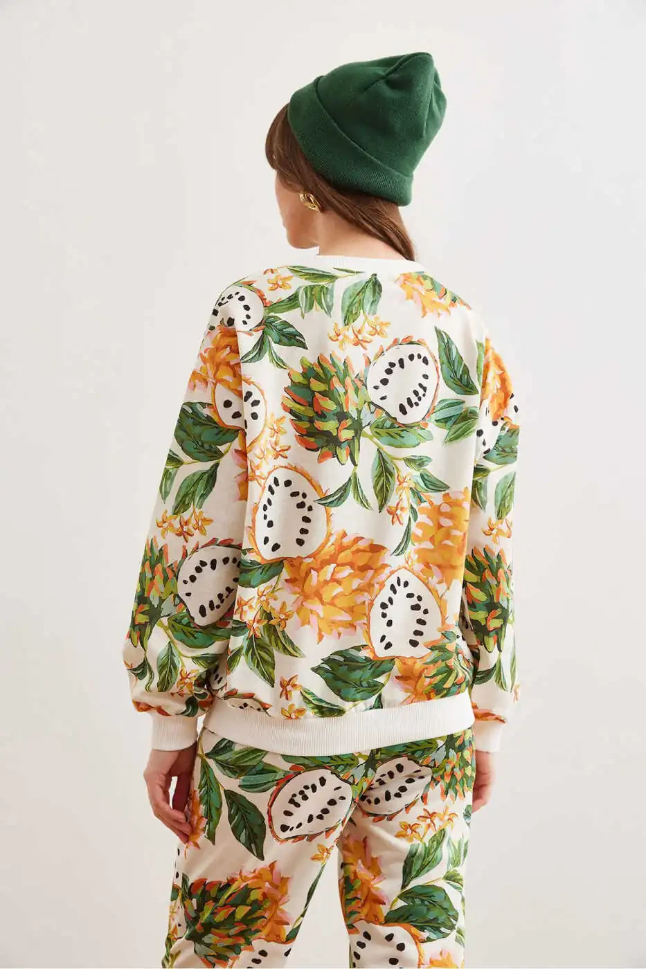 women's sweatshirt, tropical pattern sweatshirt, ecru sweatshirt, comfortable sweatshirt, soft textured sweatshirt, loose sweatshirt