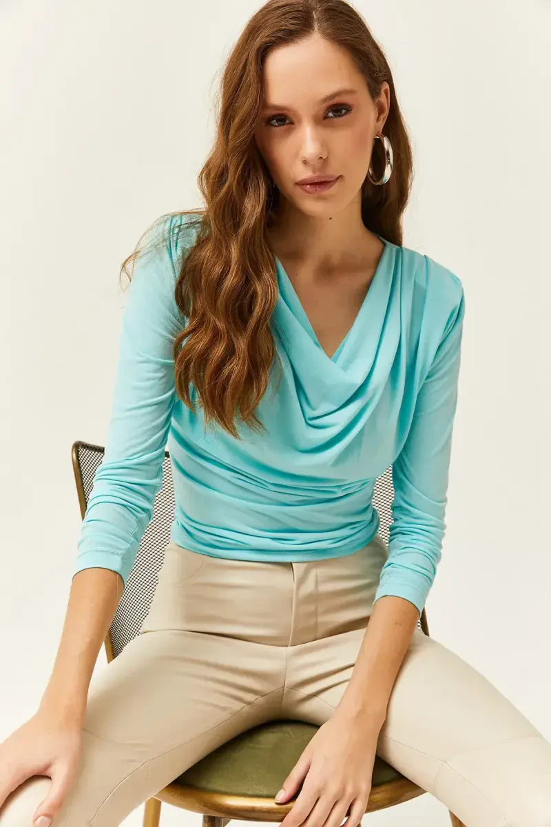 Bring your style to the forefront with the Women's Turquoise Shoulder Padded Pleated Cowl Neck Blouse, which combines elegance and modernity. This specially designed blouse is a perfect choice for both daily wear and special events. The vibrancy of the turquoise color and the blouse's elegant details will add a sophisticated touch to any outfit.**Product Description**The Women's Turquoise Shoulder Padded Pleated Cowl Neck Blouse is poised to become one of the indispensable pieces of your wardrobe. One of the most striking features of the blouse is its padded shoulders. The shoulder pad detail makes the shoulders appear more upright and strong, making your silhouette more elegant. This makes your posture look more confident and stylish. The cowl neck adds a unique touch to the blouse's design. It elegantly reveals your neck while offering a comfortable and modern look. The draped structure of the cowl neck gives the blouse a lively and dynamic appearance. Pleated details are located on the front of the blouse, adding richness and depth to the design. The pleats support the draped structure of the blouse, allowing it to fit nicely on the body. This detail ensures that the blouse has an original design, far from ordinary. The turquoise color emphasizes the blouse's energy and vibrancy. Turquoise is a color that can be easily used in both summer and winter and adapts to any environment. This color brightens your skin and adds a fresh touch to your outfit. The fabric of the blouse has a high-quality and lightweight texture. This ensures comfortable use throughout the day. The breathable structure of the fabric prevents sweating and allows your skin to breathe. The cut of the blouse is fitted to the body but does not restrict your freedom of movement. This allows you to look stylish and feel comfortable all day long. The Women's Turquoise Shoulder Padded Pleated Cowl Neck Blouse can be easily adapted to different combinations. For daily use, you can create a casual style by combining it with jeans or shorts. For special occasions, you can combine it with a skirt or fabric trousers for a more stylish and sophisticated look. You can further emphasize your style by completing the blouse with heels and elegant jewelry. This blouse will be one of the most preferred pieces in your wardrobe. You will always dazzle with its elegance, comfort and modern design. Reflect your style and make a difference in any environment with the Women's Turquoise Shoulder Padded Pleated Cowl Neck Blouse.**Product Features*** Padded shoulders* Cowl neck* Pleated details* Turquoise color* Lightweight and comfortable fabric* Body-hugging fit* Suitable for daily and special use* High quality material* Breathable fabric structure* Stylish and modern design**Additional Information**The model is wearing size S/36. Product content: 100% Polyester. Model Measurements: Height: 1.75 cm, Bust: 82 cm, Waist: 60 cm, Hips: 90 cm. To use your product for a long time, please follow the washing instructions on the label. The color of the product may vary due to light differences in studio shots.
