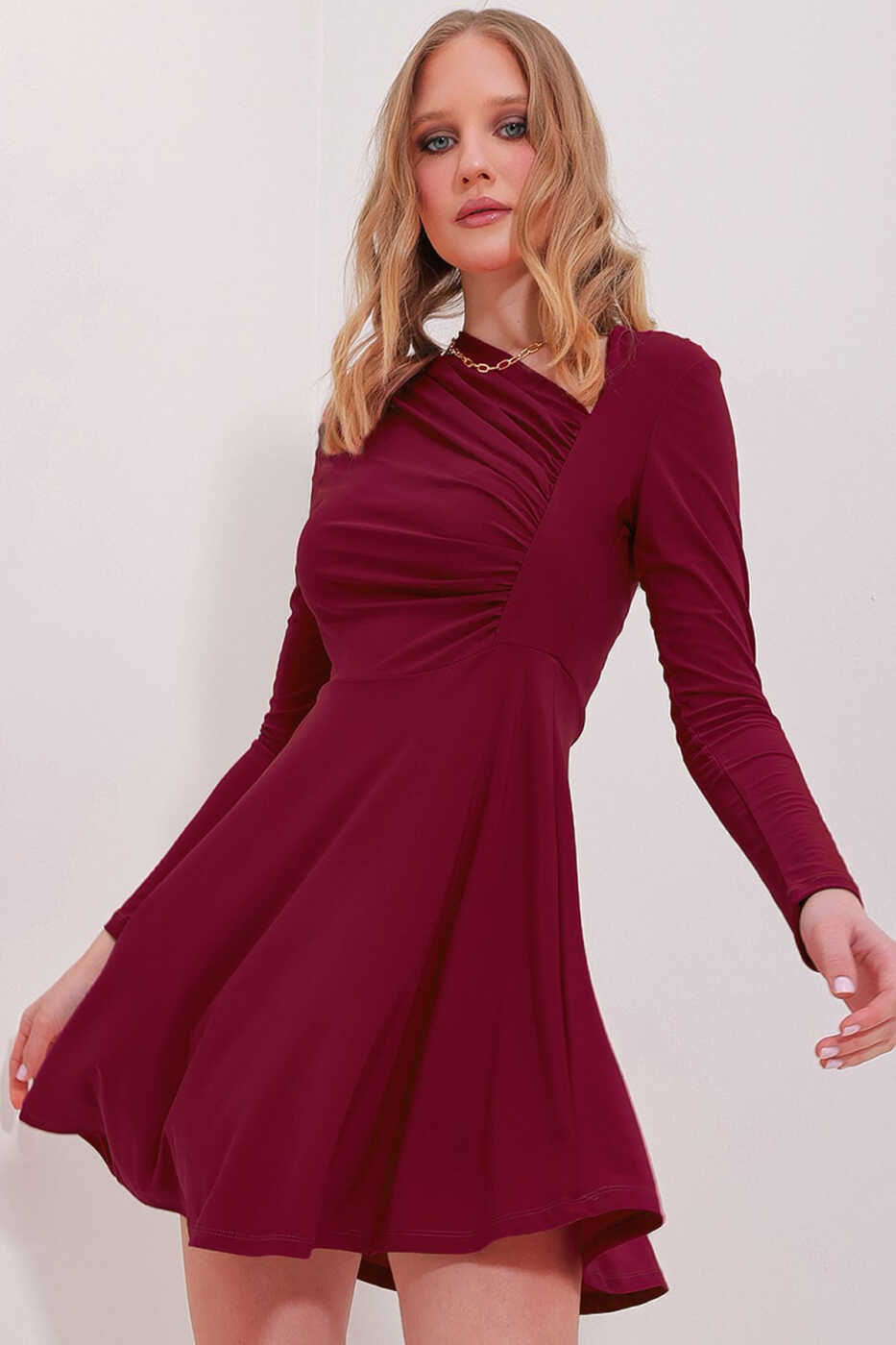 The dress, which draws attention with its violet color, offers a modern style with its asymmetrical collar and draped design. Made from sandy fabric, the dress provides comfortable use throughout the day with its soft texture and comfort. The A-line cut, which gracefully reveals your legs, is a model that can be easily worn both in everyday life and on special occasions.
