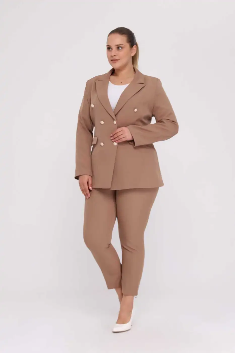 Get a stunning look in any setting with this suit that combines elegance and comfort! The visone blazer jacket, with its sleek cuts and sharp lines, offers modern elegance, while the belted pocket wide leg pants highlight comfort and style. Available in plus sizes, this suit will fit perfectly on every body and make you feel confident everywhere, from business meetings to special events.