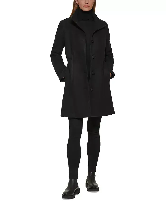 You'll be style goals in this effortless walker coat from Calvin Klein designed with a stand collar and classic single-breasted front. Approx. 35" from the center back to the hem. Mid-length Stand collar; front button closures Two side pockets Lined Created for Modazone Polyester Dry clean Imported