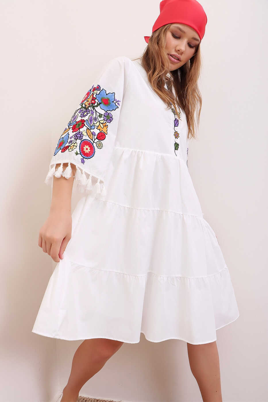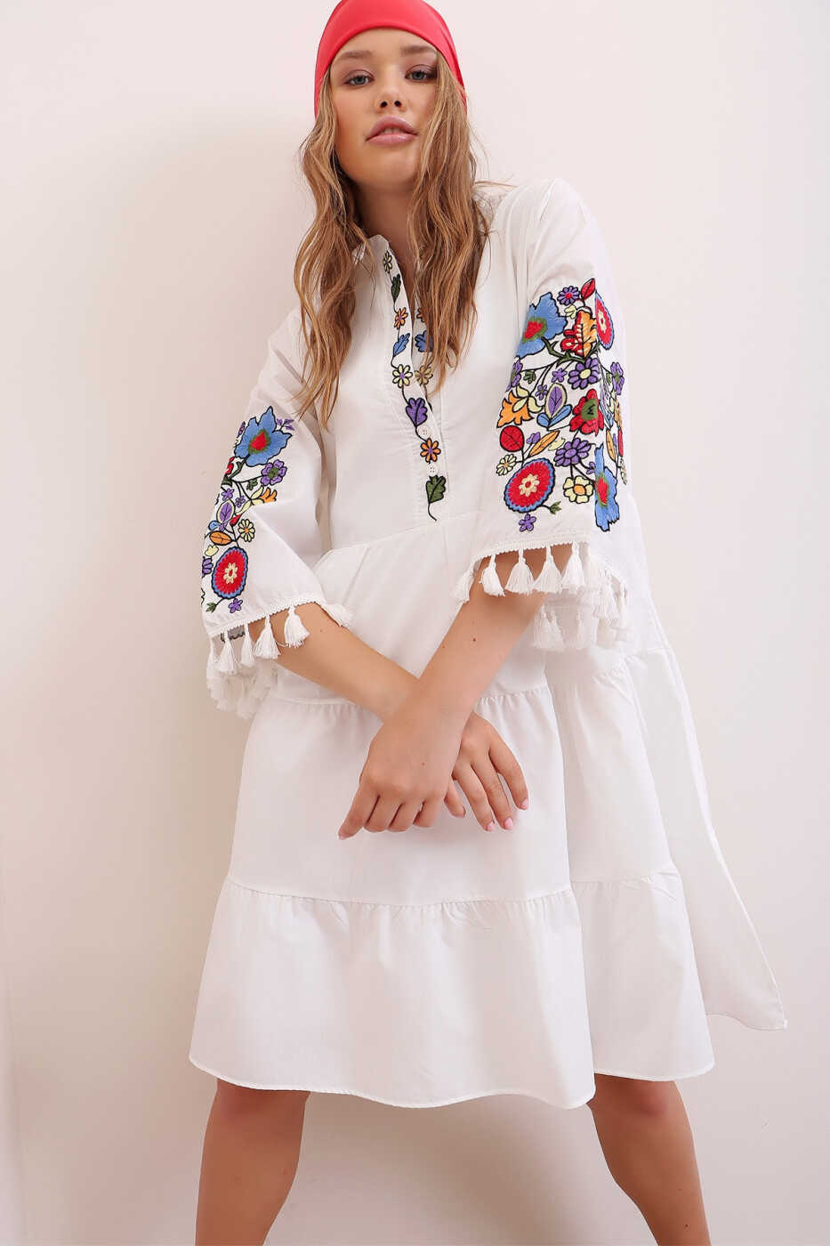 Women's White Mandarin Collar Embroidered Tassel Detailed Poplin Dress - ALC-X6915