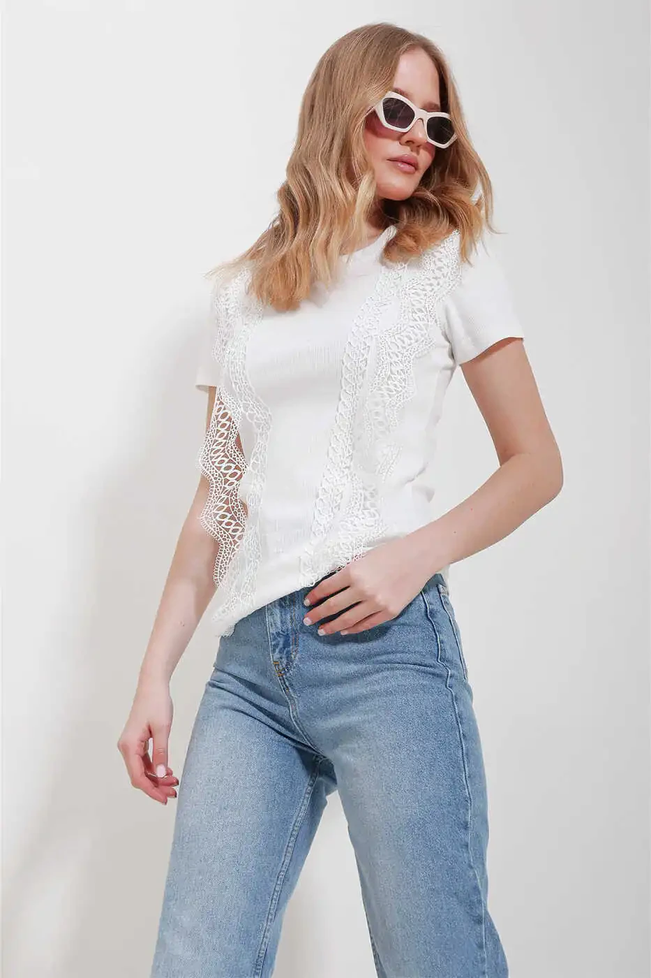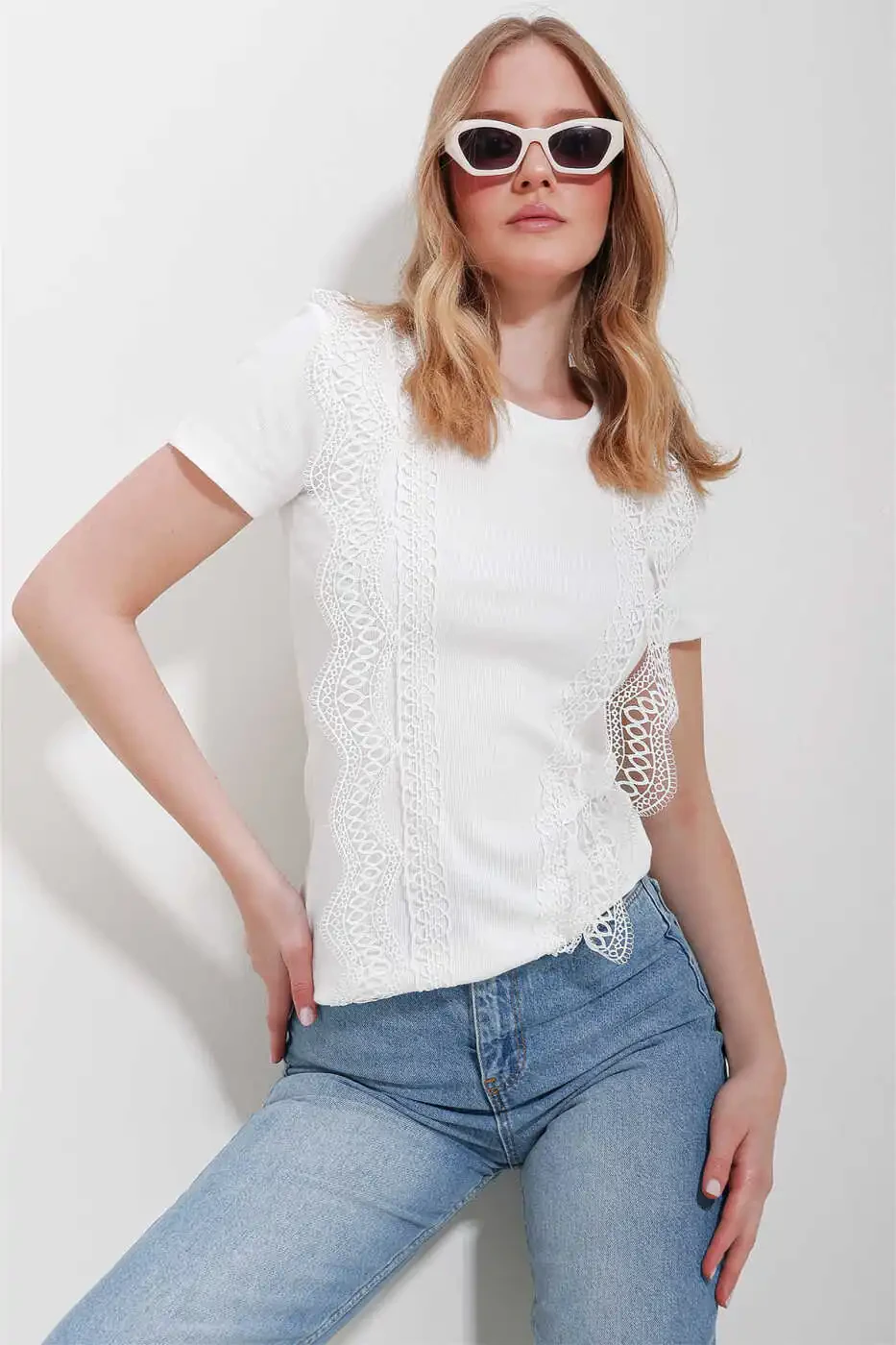 women's blouse, white blouse, crew neck blouse, guipure detail blouse, stylish blouse, elegant blouse, women's clothing, blouse models, online shopping