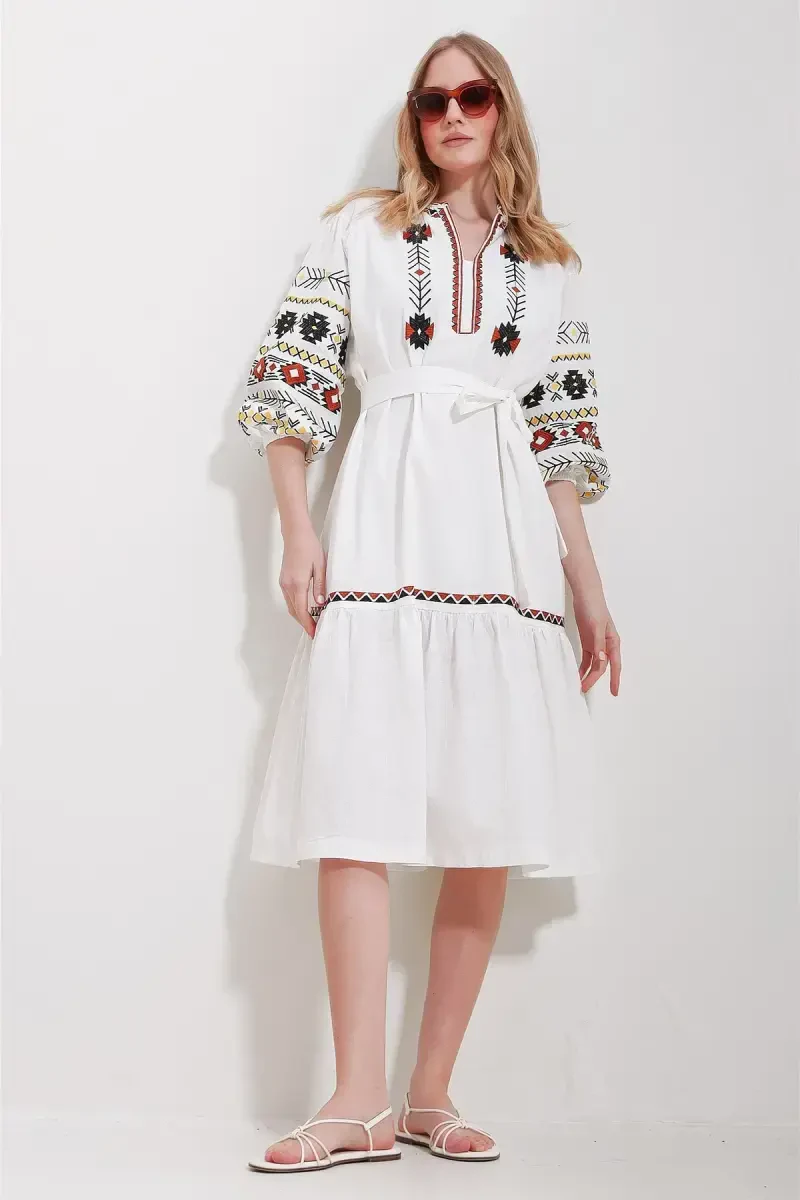This dress combines elegance and comfort, making it a must-have for your wardrobe. Featuring a chic collared neckline and balloon sleeves, this dress offers a feminine look while its inner lining provides a comfortable wearing experience. The belt detail accentuates your waist, adding a touch of elegance to your silhouette. The embroidery on the dress creates a unique style while highlighting elegance.