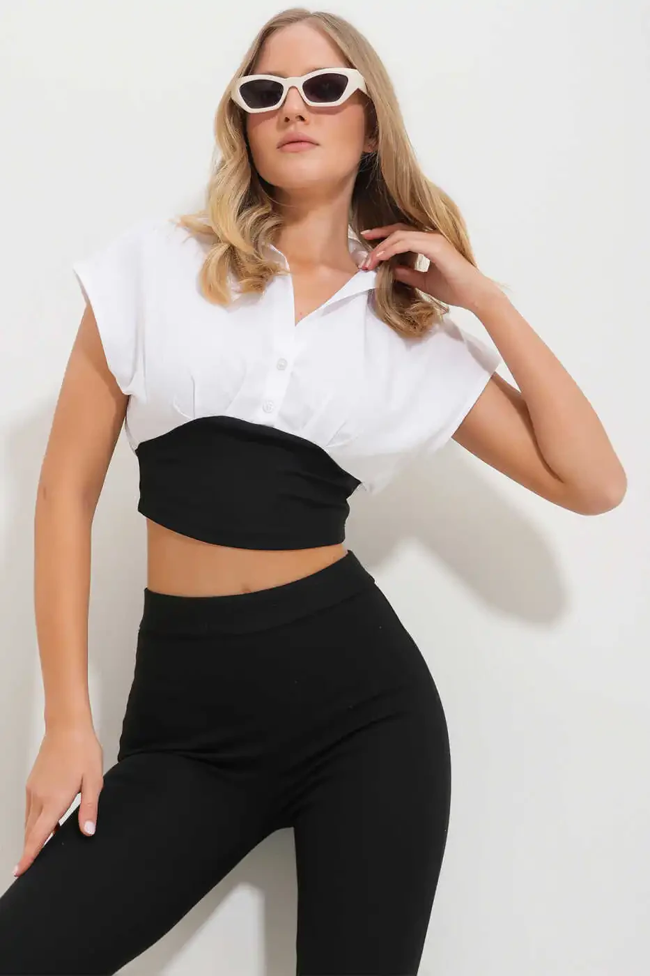 This white shirt, which combines style and comfort, is destined to be an indispensable part of your wardrobe. With its elegant collar and color-blocked details, the blouse will make you look stylish at all times, from your daily life to special occasions.