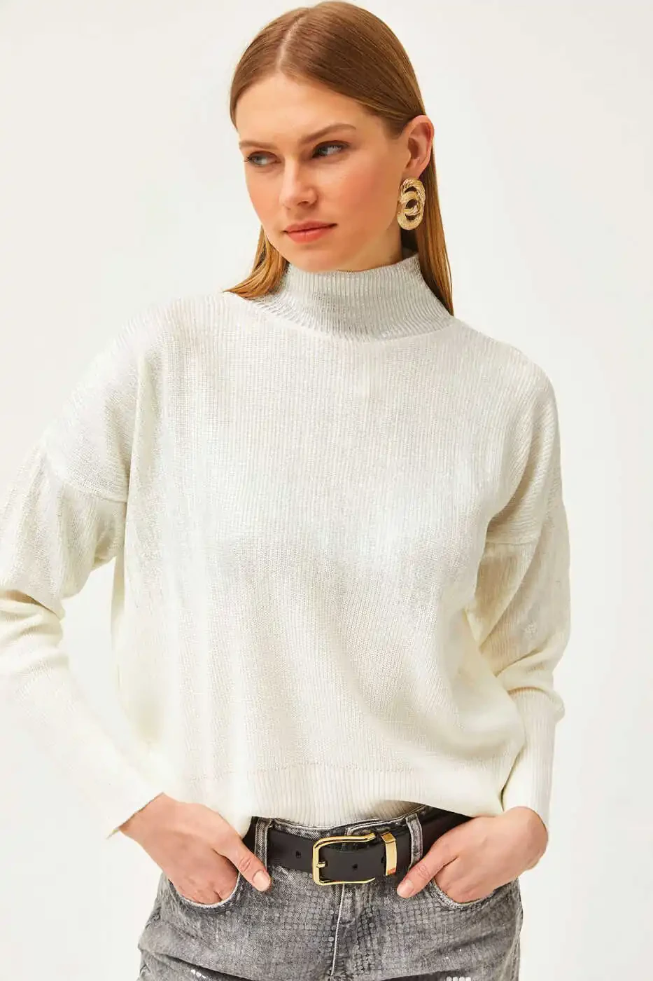 Feel both stylish and comfortable in the **Women's White Half-Turtleneck Metallic Detailed Knitted Sweater**. This eye-catching sweater offers a comfortable and chic design that's perfect for everyday wear.