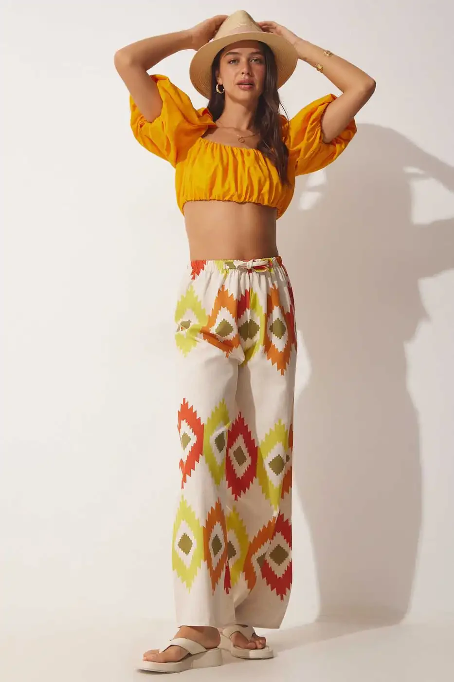 May be sold by multiple sellers. Sellers are ranked according to criteria such as price, seller rating, delivery status, promotions, shipping status, and fast delivery. A maximum of 10 items can be ordered. Orders exceeding 10 items may be canceled by Trendyol. Different limits may apply to corporate orders. For detailed return conditions, please visit the relevant page. This yellow cream floral linen palazzo pant will make a difference in your wardrobe, making every outfit stylish and modern, an indispensable piece. Order now and experience this comfortable and stylish experience!