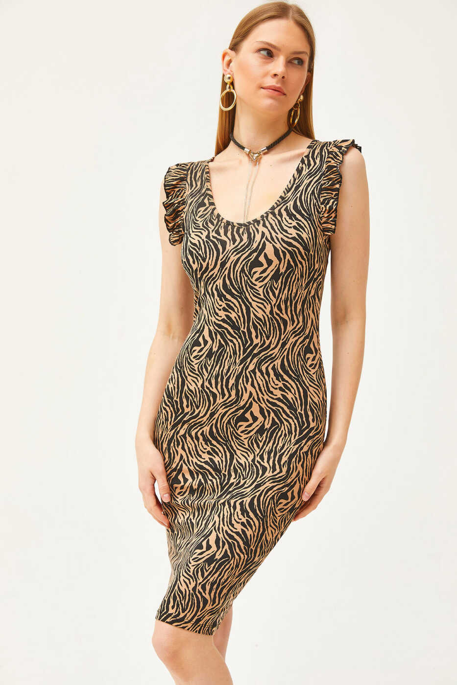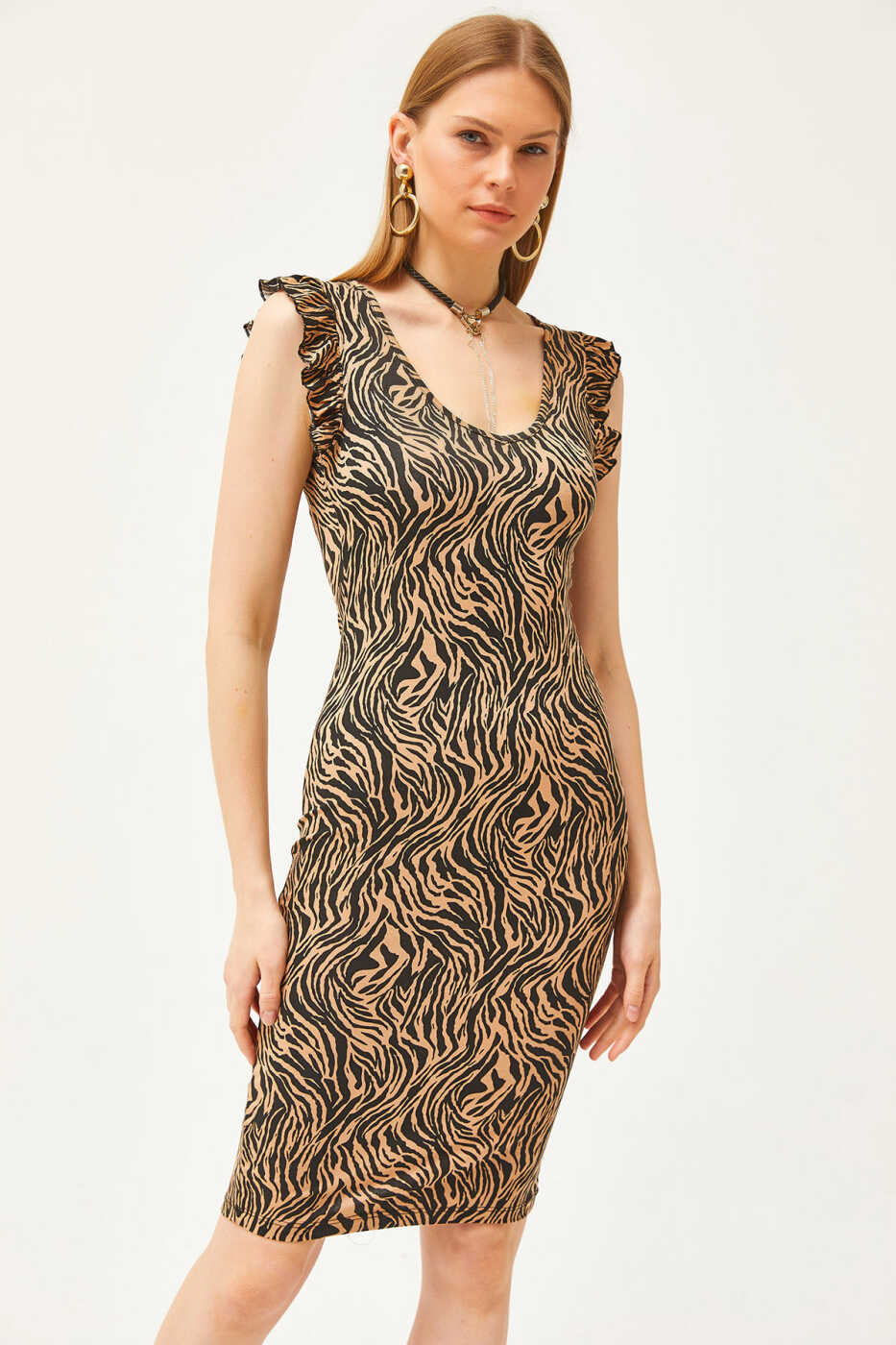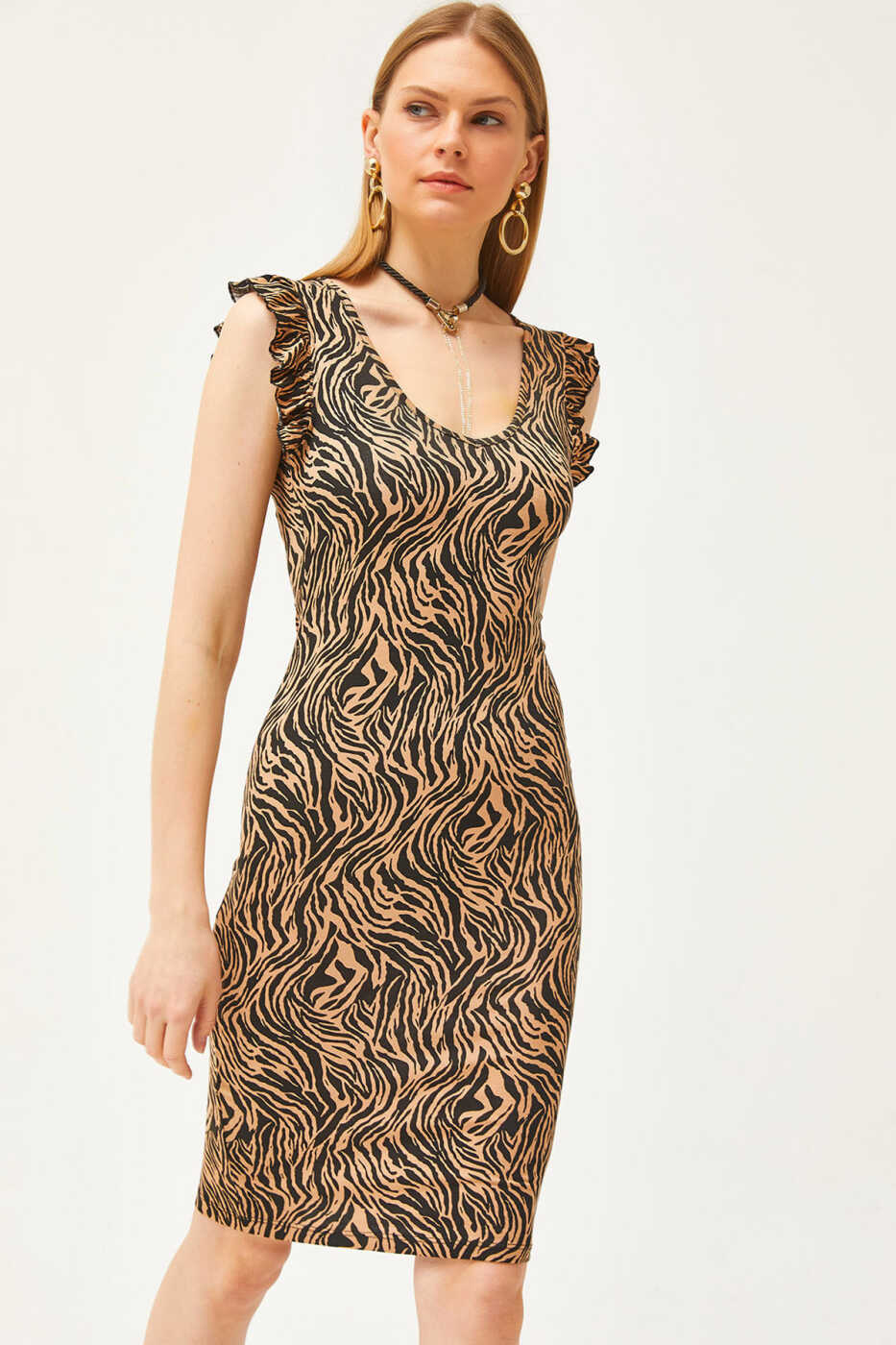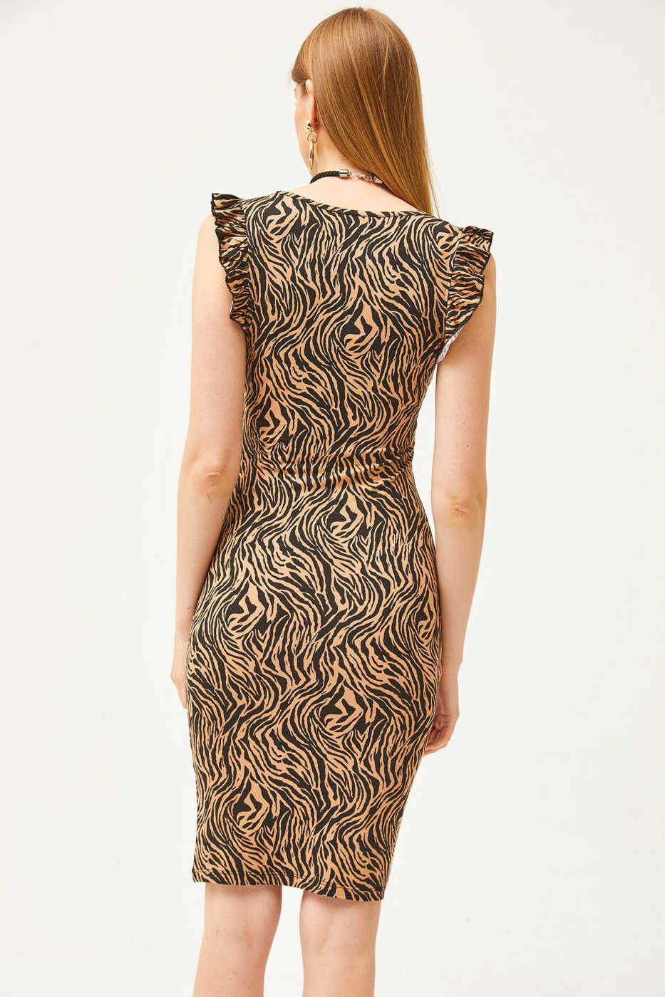 Designed to add elegance and style to your everyday look, the Women's Zebra Vizon V-Neck Shoulder Ruffle Crystal Viscose Dress will help you reflect your unique style. The unique combination of vizon color and zebra pattern creates a stunning look, while the V-neck detail gracefully highlights your neck, adding sophistication to your style. The shoulder ruffles add a lively and feminine touch. The shimmer of the fabric adorned with crystals will make you look stunning with every step.
