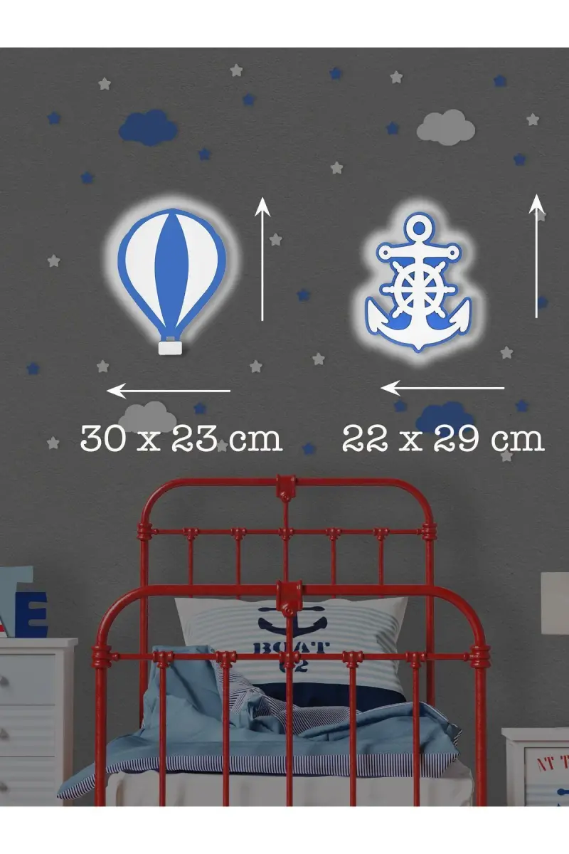 Meet the Wooden Balloon and Anchor Figured Baby and Children's Room Decorative LED Lighting/Night Lamp 2-Piece Set that will illuminate your children's dream world and add a warm and lovely touch to their rooms! This special set, carefully designed by UniQraft Design, will bring joy and peace to the little ones' world. This unique lighting set not only illuminates children's rooms but also offers a decorative feast. Balloon and anchor figures combine sea and sky themes, stimulating children's imaginations. The blue tones of the wooden details add a calm and serene atmosphere to the room, making it easier to fall asleep. The set includes 30 wooden stars and 4 clouds, allowing you to create a fairytale atmosphere by sprinkling them on the walls or furniture of the room. This set, with which you can create big differences with small touches, is the most enjoyable way to personalize your children's room. The white LED lights on the lighting emit a soft, non-glaring light and can also be used as a night light. It helps your children fall asleep comfortably while providing them with a safe and peaceful environment. The fact that it is made of wooden material ensures that the product is natural and healthy, while offering long-lasting use. The installation of the products is extremely easy. Thanks to the hanging brackets on the back of the lighting, they can be easily hung with the help of a nail or screw, and the wooden stars and clouds can be attached to the desired surface with double-sided tape. In this way, you can complete the installation in a short time without the need for any professional help. The Wooden Balloon and Anchor Figured Baby and Children's Room Decorative LED Lighting/Night Lamp 2-Piece Set is not just a lighting product, but also a decoration item that will add love and joy to your children's room. Do not miss this special set that will decorate their dreams, accompany their games and provide a safe sleeping environment. Order now and transform your children's room into a fairytale world!