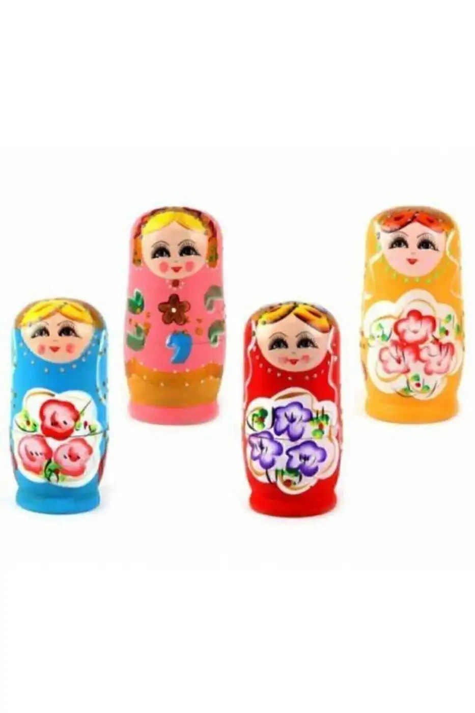 Matryoshka, a traditional Russian hand-crafted art, is a set of nested painted wooden dolls. This 5-piece set includes five matryoshka dolls, each painted in a different color and pattern. The largest matryoshka contains four smaller matryoshkas inside. The matryoshkas are decorated with traditional Russian motifs and patterns.