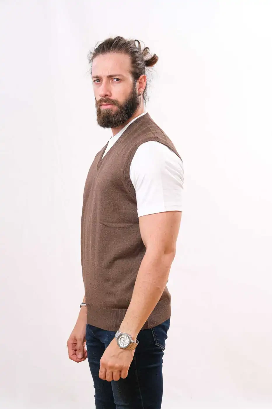 If you're looking for a stylish and comfortable wool sleeveless knit sweater to keep you warm on cold winter days, you've come to the right place! Made from high quality wool, this sweater will impress you with its soft texture and warmth. Its sleeveless design allows you to achieve a stylish look without restricting your freedom of movement.