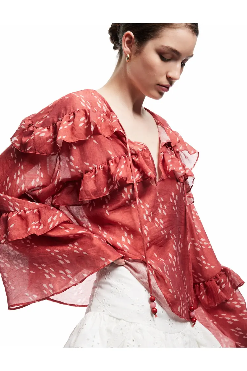 X Melis Ağazat - Uzun Kollu Bağlama Yaka Detaylı Desenli Fırfırlı Bluz