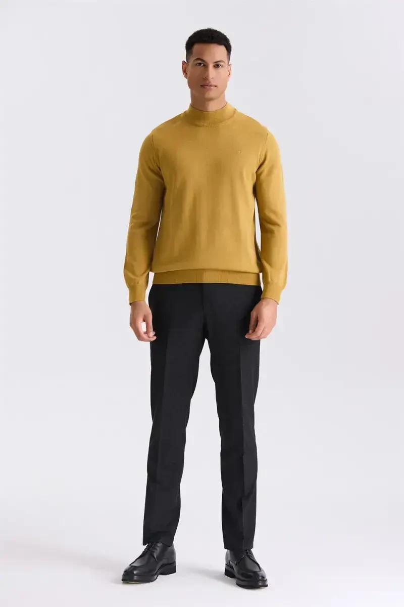 Nozik uslubi va qulay tuzilishi bilan ushbu xantal Slim Fit yarim boʻyinli triko jemper ham kundalik kiyimlar, ham maxsus kunlar uchun ajoyib tanlovdir.