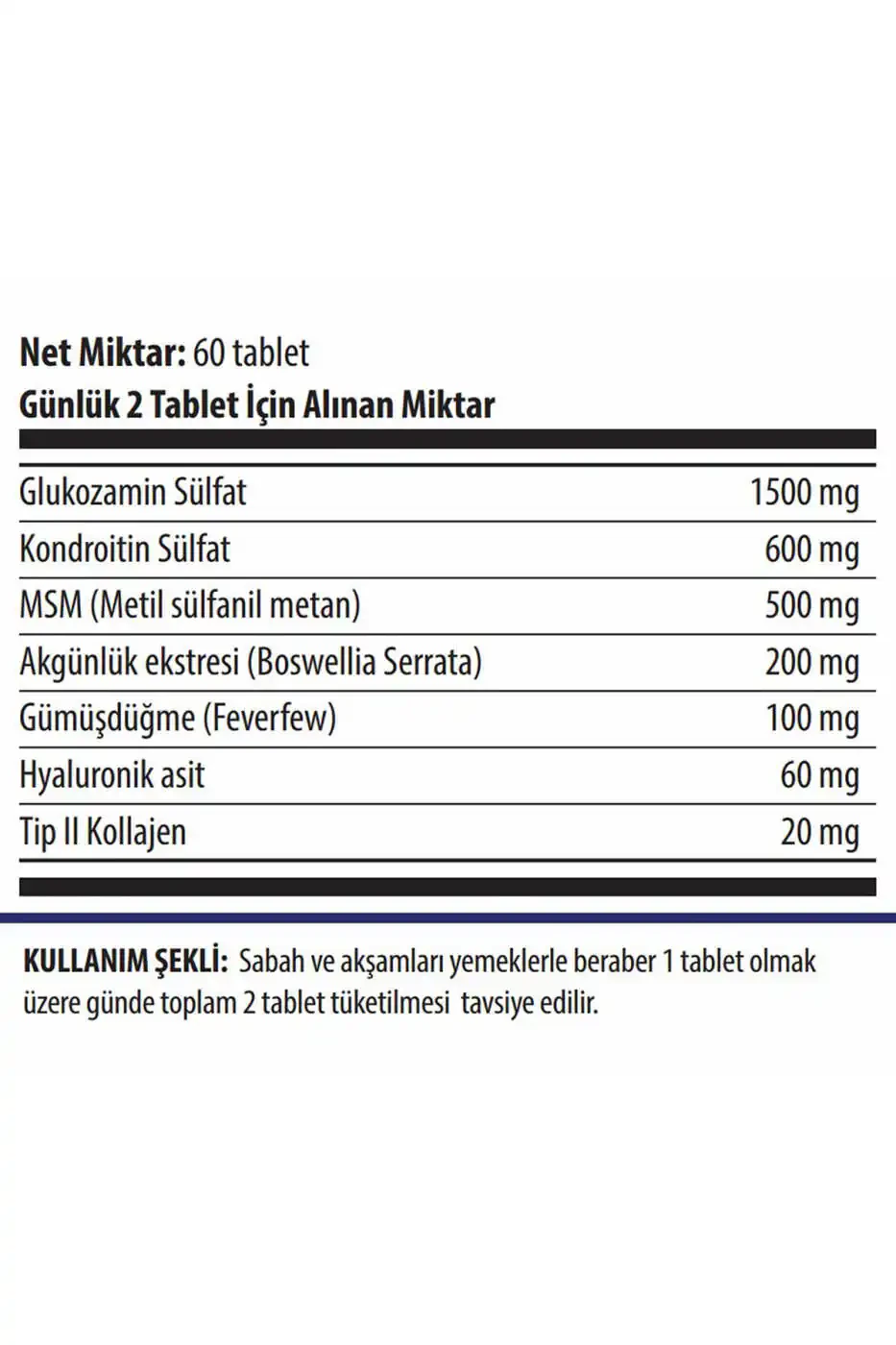 - MSM (Metil Sülfonil Metan): Kıkırdağın sağlıklı kalmasına yardımcı olur ve iltihabı azaltır.