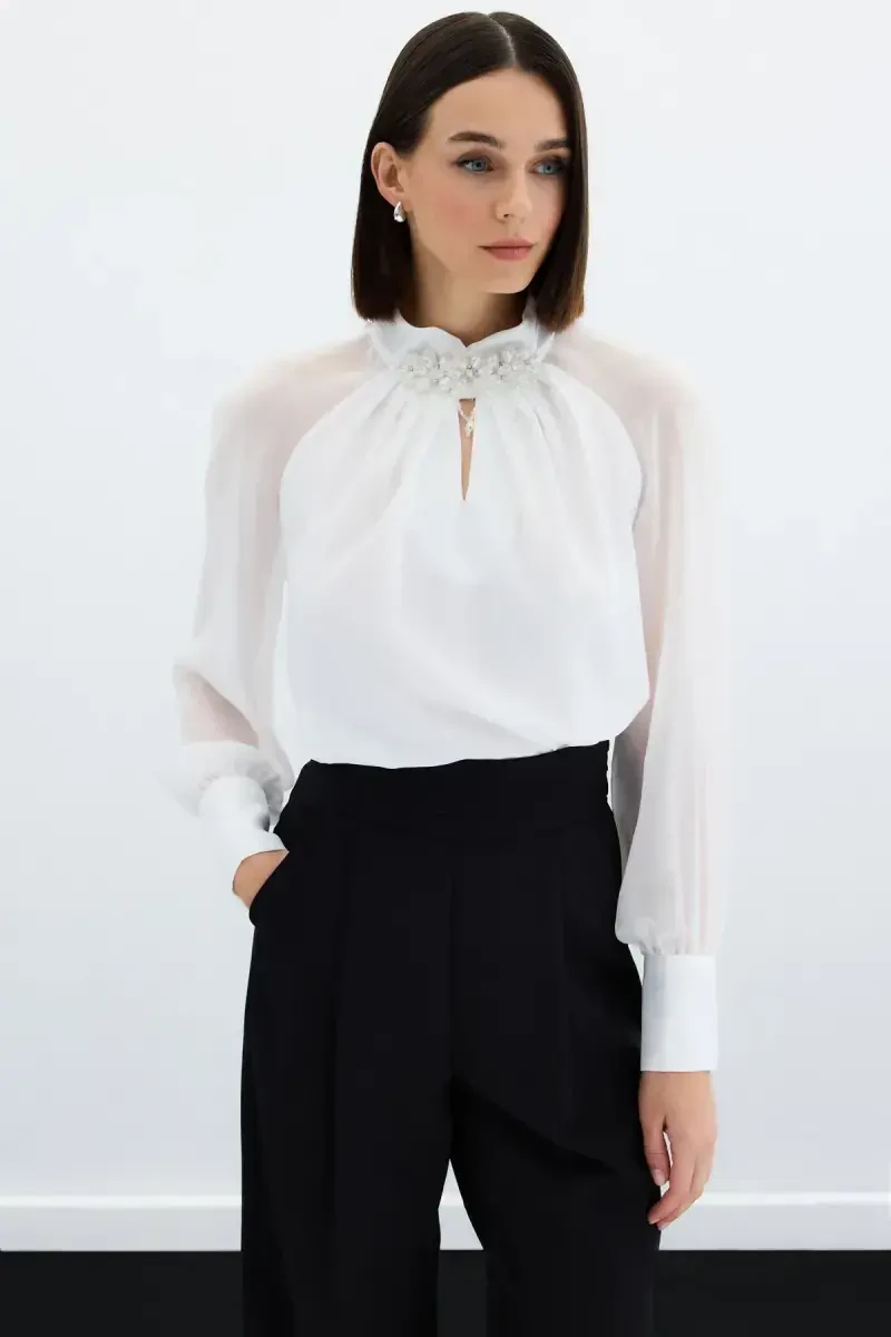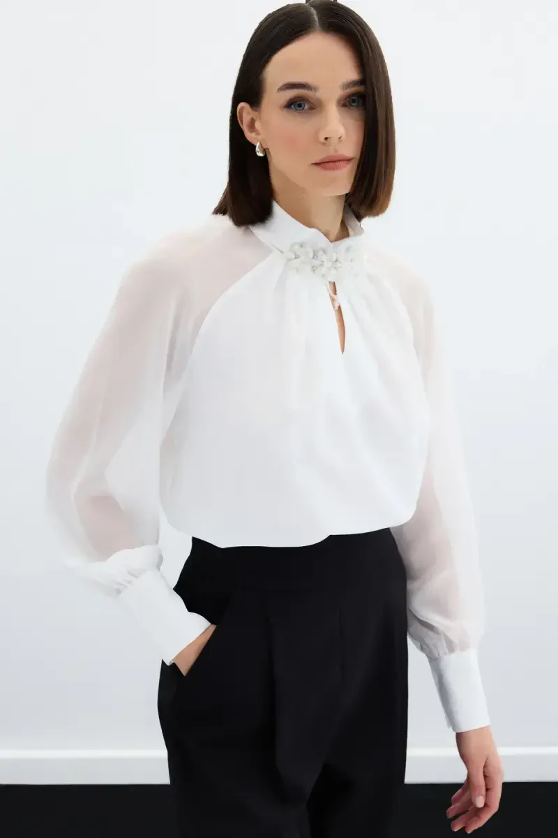 Nafislik va uslubni birlashtirgan Yaka Aksessuarili Blyuzka sizning garderobingizning ajralmas qismiga aylanadi. EKRU rangi har qanday terining rangiga mos keladi, sizni maxsus kunlarda yoki kundalik hayotda zamonaviy ko'rinishga ega bo'lishingizni ta'minlaydi. Yakaning yupqa va nafis aksessuari blyuzkaning sodda dizaynini to'ldiradi va uning nafisligini oshiradi. Yumshoq va sifatli matodan tayyorlangan blyuzka qulay kiyinishni ta'minlaydi.