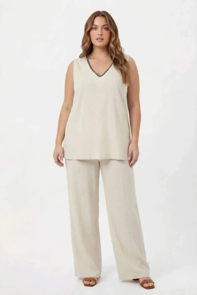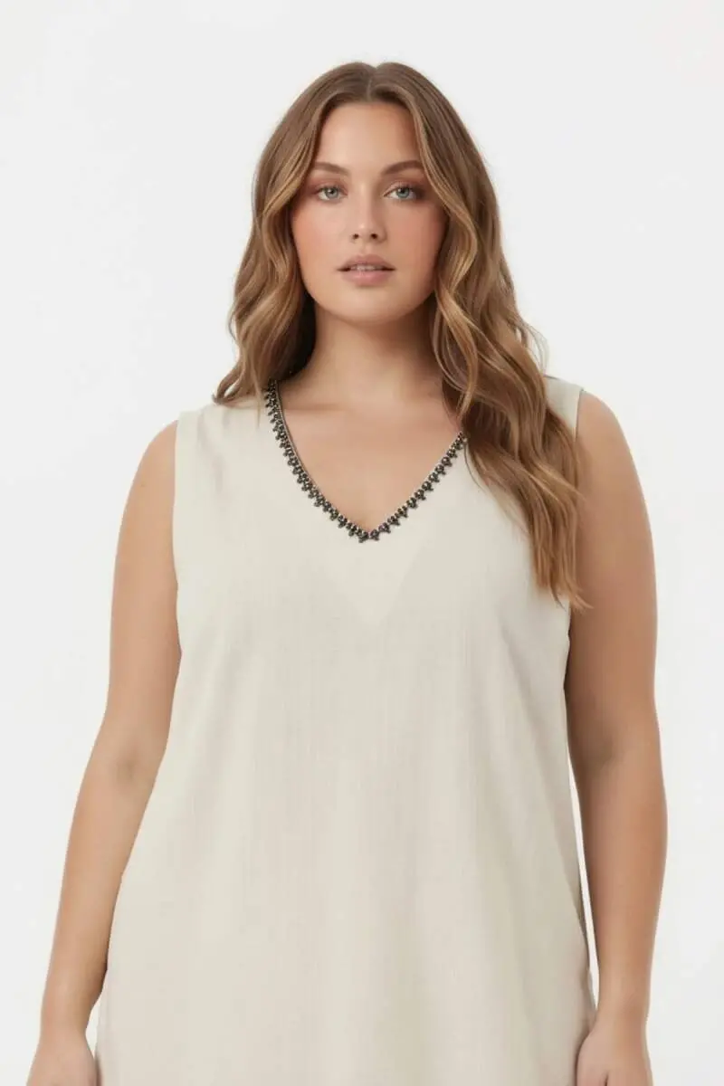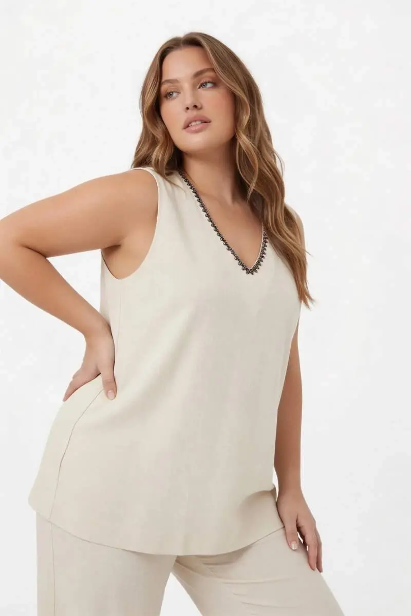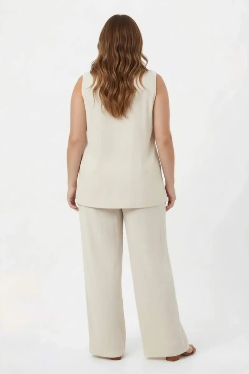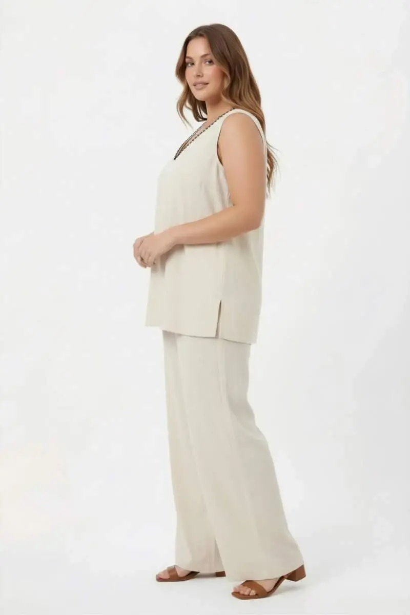 Yaka Boncuk Detaylı Kadın Büyük Beden Bluz Pantolon Takım Bej