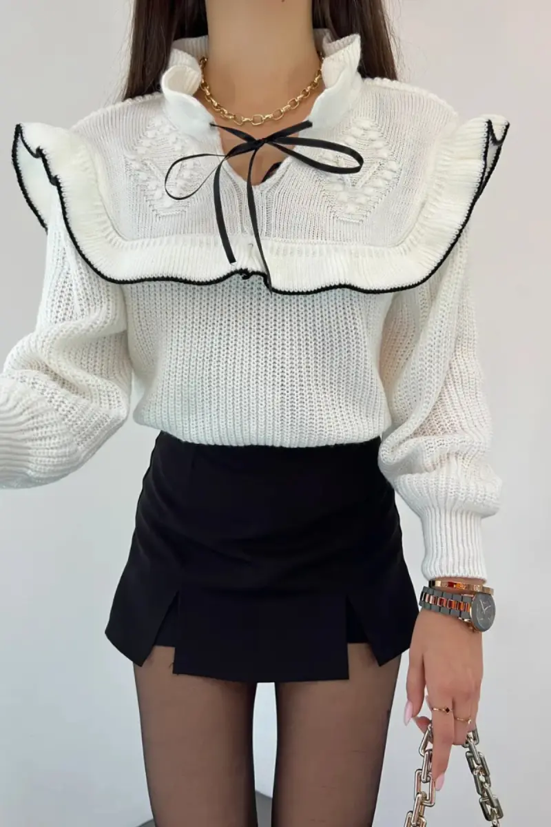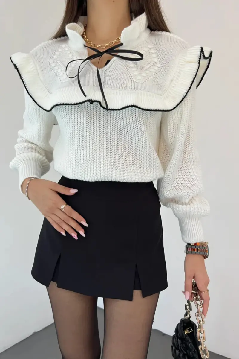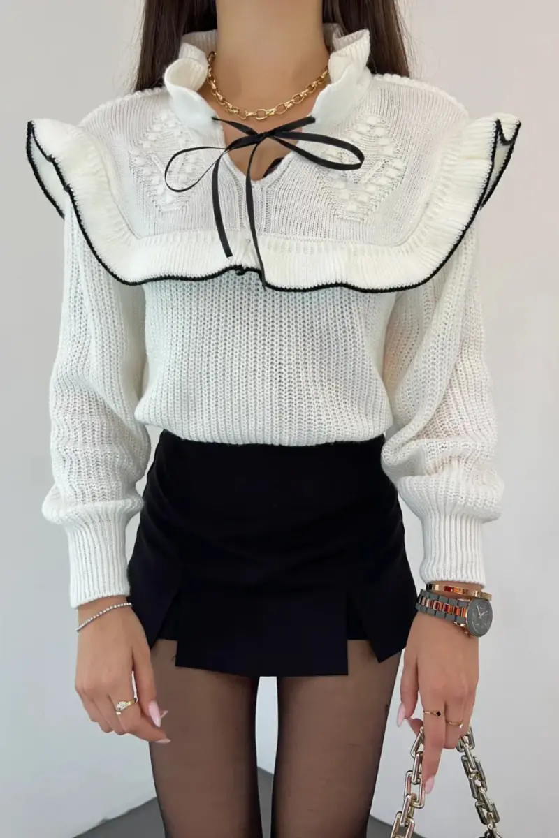 Bu ürün Çelebi Moda tarafından gönderilecektir.Kampanya fiyatından satılmak üzere 5 adetten az stok bulunmaktadır.Bir ürün, birden fazla satıcı tarafından satılabilir. Birden fazla satıcı tarafından satışa sunulan ürünlerin satıcıları ürün için belirledikleri fiyata, satıcı puanlarına, teslimat statülerine, ürünlerdeki promosyonlara, kargonun bedava olup olmamasına ve ürünlerin hızlı teslimat ile teslim edilip edilememesine, ürünlerin stok ve kategorileri bilgilerine göre sıralanmaktadır.Bu üründen en fazla 10 adet sipariş verilebilir. 10 adedin üzerindeki siparişleri Trendyol iptal etme hakkını saklı tutar. Belirlenen bu limit kurumsal siparişlerde geçerli olmayıp, kurumsal siparişler için farklı limitler belirlenebilmektedir.15 gün içinde ücretsiz iade. Detaylı bilgi için [page="return_conditions"]tıklayın .Bu zarif kadın ekru fırfırlı detaylı selanik örgü kazak, şık ve rahat bir görünüm sunar.Düz deseniyle sade ve zamansız bir stil oluştururken, uzun kollu tasarımı soğuk havalarda sizi sıcak tutar.Dik yakası ile modern bir duruş sergiler.Akrilik-pamuk karışımından yapılan materyali hem yumuşak dokunuşu hem de dayanıklılığıyla öne çıkar.Regular kalıbı sayesinde vücut hatlarınıza uyum sağlar ve rahat hareket etme olanağı tanır.Basic siluetiyle günlük kullanım için idealdir ve casual ortamlarda şıklığınızı korumanızı sağlar.Selanik dokuması, bu kazakta sofistike bir hava katarken, fırfırlı detaylarıyla feminen çizgiler sunar.LİKRALI POLYELİT içeriğiyle konforlu bir kullanım vaat eder.Yıkama talimatlarına uygun şekilde bakım yapıldığında uzun süre ilk günkü formunu korur.Kalın yapısıyla mevsim geçişlerinde ideal sıcaklık dengesi sağlar.21 - 40 yaş aralığındaki kadınlar için uygundur.Basic koleksiyonunun zarif bir parçası olarak gardrobunuzda yerini alacak bu kazak, casual giyimin vazgeçilmez parçasını oluşturur.