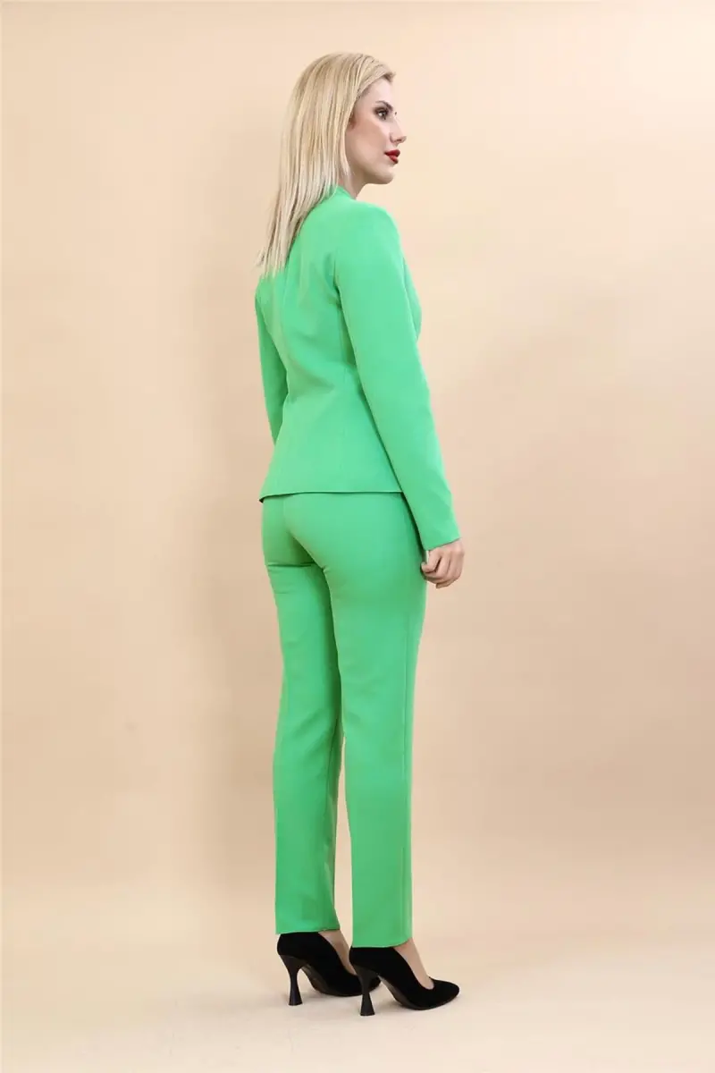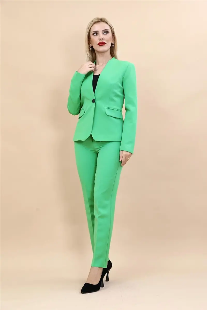 Yakasız tek düğmeli ceket ve boru paça pantolon takımımız, gardırobunuzun vazgeçilmez bir parçası olmaya aday. A.Yeşil renginin ferahlatıcı etkisi, bu takımı her mevsim giyilebilir kılıyor. Ceketin yakasız tasarımı, modern ve minimalist bir görünüm sunarken, tek düğme detayı şıklığı tamamlıyor. Boru paça pantolon ise vücut hatlarını zarifçe ortaya çıkararak, uzun ve ince bir siluet yaratmanıza yardımcı oluyor. Bu takım, iş toplantılarından özel davetlere, günlük şıklığınızdan hafta sonu gezmelerine kadar her ortamda rahatlıkla kullanılabilir.Kumaşının kalitesi, gün boyu konfor sunarken, kırışmaya dayanıklı yapısı sayesinde her zaman bakımlı görünmenizi sağlar. Takımın kesimi, hareket özgürlüğünüzü kısıtlamadan vücudunuza oturur ve şık bir duruş sergilemenize olanak tanır. İster topuklu ayakkabılarla kombinleyerek daha resmi bir görünüm elde edin, isterseniz de spor ayakkabılarla kombinleyerek daha rahat ve günlük bir stil yaratın. Yakasız tek düğmeli ceket ve boru paça pantolon takımımız, her tarza uyum sağlayabilen çok yönlü bir parçadır.A.Yeşil renginin huzur veren tonu, bu takımı diğer renklerle kolayca kombinlemenizi sağlar. Beyaz bir bluz veya gömlek ile klasik bir görünüm elde edebilir, farklı renklerdeki aksesuarlarla tarzınızı kişiselleştirebilirsiniz. Takımın her bir parçası ayrı ayrı da kullanılabilir, böylece gardırobunuzdaki diğer parçalarla sonsuz kombinasyonlar yaratabilirsiniz. Yakasız ceketi jean pantolon veya eteklerle, boru paça pantolonu ise farklı üstlerle kombinleyerek kendi stilinizi yansıtabilirsiniz.Yakasız tek düğmeli ceket ve boru paça pantolon takımımız, sadece şık değil, aynı zamanda pratik bir seçenektir. Kolayca temizlenebilir ve ütülenebilir yapısı sayesinde, yoğun temponuzda size zaman kazandırır. Bu takım, hem stil sahibi olmak isteyen hem de konforundan ödün vermek istemeyen kadınlar için ideal bir tercihtir. Gardırobunuzun en sevilen parçası olmaya aday olan bu takım ile her zaman şık ve kendinden emin hissedebilirsiniz.