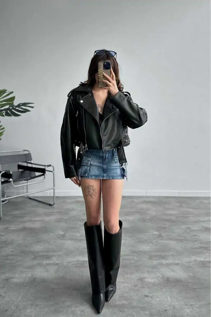 Yangi mavsumning eng trendli buyumlaridan biri bo'lgan oversize ayollar uchun qora biker charm ko'ylagi bilan o'zingizni yanada chiroyli ko'rsating! Klassik biker uslubini zamonaviy teginish bilan birlashtirgan ushbu ko'ylagi har qanday kiyimingizga sofistikatsiya baxsh etadi.