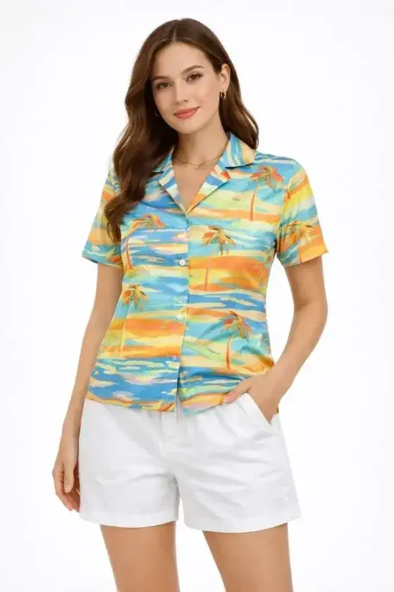 Yazlık Tropikal Desenli Gömlek Şort Takım Rahat Kalıp Tatil Kombin - DesenliModelin Ölçüleri: Boy: 165, Kg: 55, Göğüs: 90, Bel: 72, Kalça: 100Modelin üzerindeki ürün M/38 bedendir