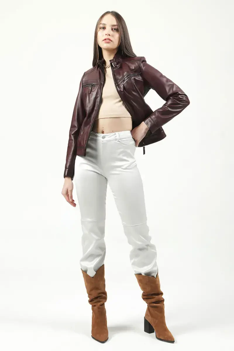 %100 LEATHER. Lined. Long Sleeve. Zipper Closure. Side Pockets.Product DescriptionYb2107 Real Leather Women's Jacket Burgundy-BURGUNDY is a design marvel that combines elegance and quality, and is a candidate to be an indispensable part of your wardrobe. Made of 100% genuine leather, this jacket will maintain its quality as if it were the first day for many years and will accompany you. The elegance of the burgundy color adds a sophisticated touch to every combination, while its modern cut ensures you always look trendy.The lining inside the jacket offers comfortable use all day long. While keeping you warm in cold weather, it also prevents sweating and provides a comfortable experience. The long-sleeved design provides both a stylish look and helps protect you from the cold. The zippered closure system allows you to easily put on and take off the jacket, while also preventing wind from entering, keeping you even warmer.Yb2107 Real Leather Women's Jacket Burgundy-BURGUNDY also prioritizes practicality. Thanks to its side-pocket design, you can safely carry your phone, keys or other small items. These pockets both complement the aesthetic appearance of the jacket and provide great convenience in your daily life.This jacket is not only stylish and useful, but also a timeless piece. The harmony of the classic cut and burgundy color makes it easily combinable with any style. Whether you create a sporty chic look with a casual combination, or complete it with an elegant dress for a special occasion, Yb2107 Real Leather Women's Jacket Burgundy-BURGUNDY will always help you reflect your style in the best way.Due to the fact that it is genuine leather, your jacket will become more beautiful over time and will have a unique look that reflects your personality. Leather softens over time and develops a natural patina, making your jacket more special every day. Yb2107 Real Leather Women's Jacket Burgundy-BURGUNDY is not just a garment, but also an investment and an expression of your style. With this jacket, you will attract attention in any environment and prove that you are stylish. Don't miss out on this jacket, which is a candidate to be the most valuable piece of your wardrobe!Product Features* 100% Genuine Leather* Lined Interior* Long Sleeve* Zipper Closure* Side Pockets* Burgundy Color* Modern Cut* Stylish and Useful Design* Timeless Piece* Easy CombinabilityAdditional InformationIt is recommended to clean and ventilate the product with products suitable for leather care in order to ensure its long life. It is important to keep it away from direct sunlight and moisture.