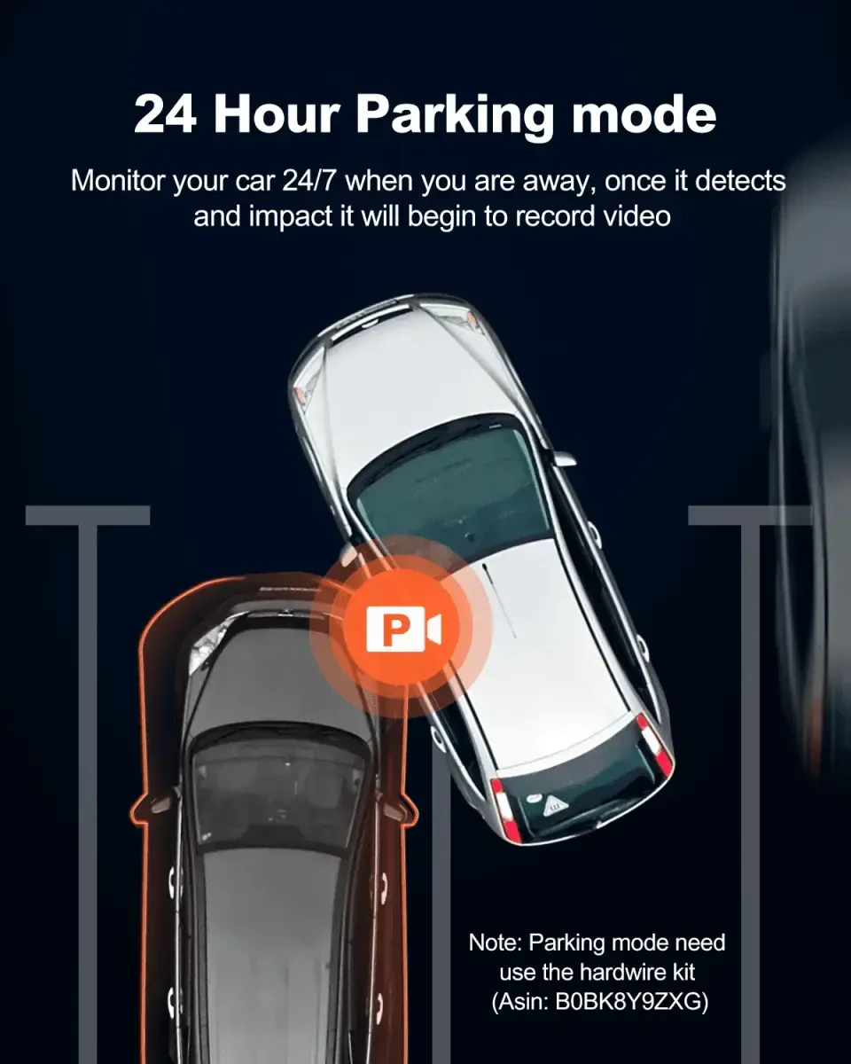 - Режим парковки 24/7 (с дополнительным комплектом проводов, продается отдельно) обнаруживает и записывает возможные аварии, когда ваш автомобиль припаркован.