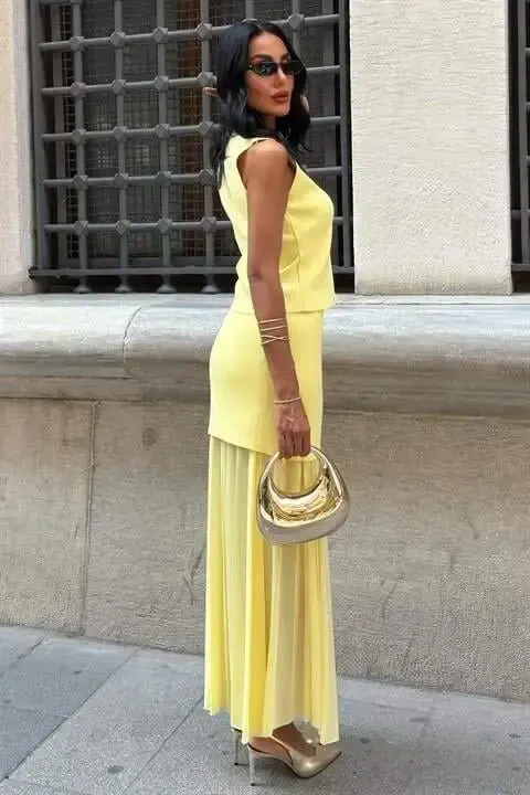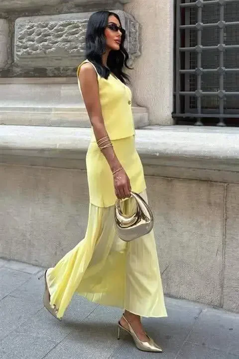 Yelekli va plise etakli trikotaj kostyumi 10001 bilan nafislik va qulaylikni birga his eting. Ushbu maxsus dizayndagi trikotaj kostyum zamonaviy ayolning garderobida bo'lishi kerak bo'lgan elementlardan biridir. Kundalik foydalanish hamda maxsus tadbirlar uchun ideal bo'lgan ushbu kostyum nafislik va qulaylikni birlashtiradi. Yuqori sifatli trikotaj material tufayli kun bo'yi qulaylikni ta'minlaydi, plise etak detali esa harakatli va nafis ko'rinishni ta'minlaydi. Yelek detali esa kostyumga boshqa o'lcham berib, kombinatsiyalaringizga xilma-xillik qo'shishga imkon beradi.Kostyumning eng diqqatga sazovor xususiyatlaridan biri - bu tanaga mos kesimi tufayli mukammal siluet yaratishi. Trikotaj matoning elastikligi harakat erkinligingizni cheklamagan holda sizga to'liq mos kelishini ta'minlaydi. Plise etak qadamlaringizga nafislik qo'shsa, yelek ham nafislikni to'ldiradi, ham turli kombinatsiyalarni yaratish imkonini beradi. Xoh alohida, xoh turli xil ustki kiyimlar bilan birlashtirib foydalanishingiz mumkin bo'lgan ushbu kostyum har qanday muhitda o'z uslubingizni namoyon etishingizga imkon beradi.Yelekli va plise etakli trikotaj kostyumi 10001 turli xil o'lchamdagi variantlar bilan har bir tana turiga mos keladigan alternativalarni taklif etadi. Modeldagi M/38 o'lcham ideal kesim va ko'rinishni namoyish etadi. Kostyumning rang variantlari har qanday didga mos keladigan tarzda ehtiyotkorlik bilan tanlangan. Klassik ranglar bilan bir qatorda, mavsumning trend ranglarini ham o'z ichiga olgan ushbu kostyum uslubingizga zamonaviy teginish qo'shadi.Ushbu trikotaj kostyum nafaqat nafis ko'rinishga ega bo'lish bilan birga, foydalanish qulayligini ham ta'minlaydi. Yuqori sifatli trikotaj material oson yuviladi va dazmollanadi. Shu sababli, har doim ozoda va nafis ko'rinishingizni ta'minlaydi. Garderobingizning ajralmas qismiga aylanadigan ushbu kostyum uzoq umr ko'rish bilan ham ajralib turadi.Yelekli va plise etakli trikotaj kostyumi 10001 bilan uslubingizni yuqori darajaga ko'taring. Ham qulaylik, ham nafislikni birga taqdim etadigan ushbu maxsus dizayndagi kostyum har bir ayolning orzusidagi elementga aylanadi. Ko'zni qamashtiruvchi detallari va mukammal kesimi bilan har qanday muhitda e'tiborni tortasiz. O'zingizni maxsus his etish va uslubingizni aks ettirish uchun ushbu kostyumni albatta sinab ko'rishingiz kerak. Unutmang, nafislik detallarda yashiringan va bu kostyum har bir detali bilan sizni hayratga soladi.