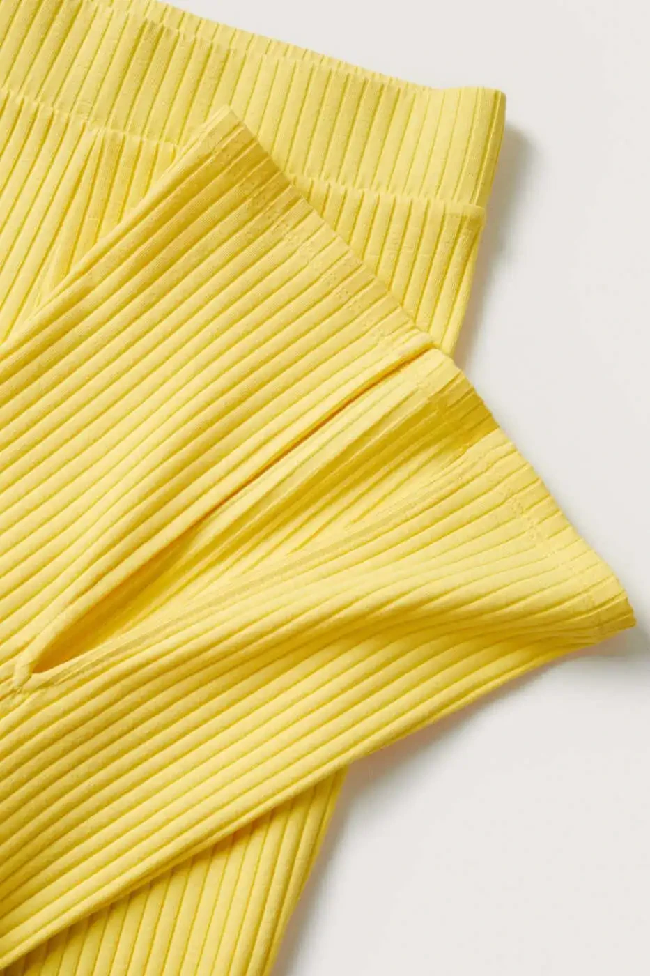 These **yellow women's pants** are made from 94% cotton and 6% elastane, providing a comfortable and relaxed fit all day long. The wide-leg design creates a modern and stylish look while allowing for freedom of movement. Suitable for a wide range of body types, these pants are designed to flatter women of all ages.