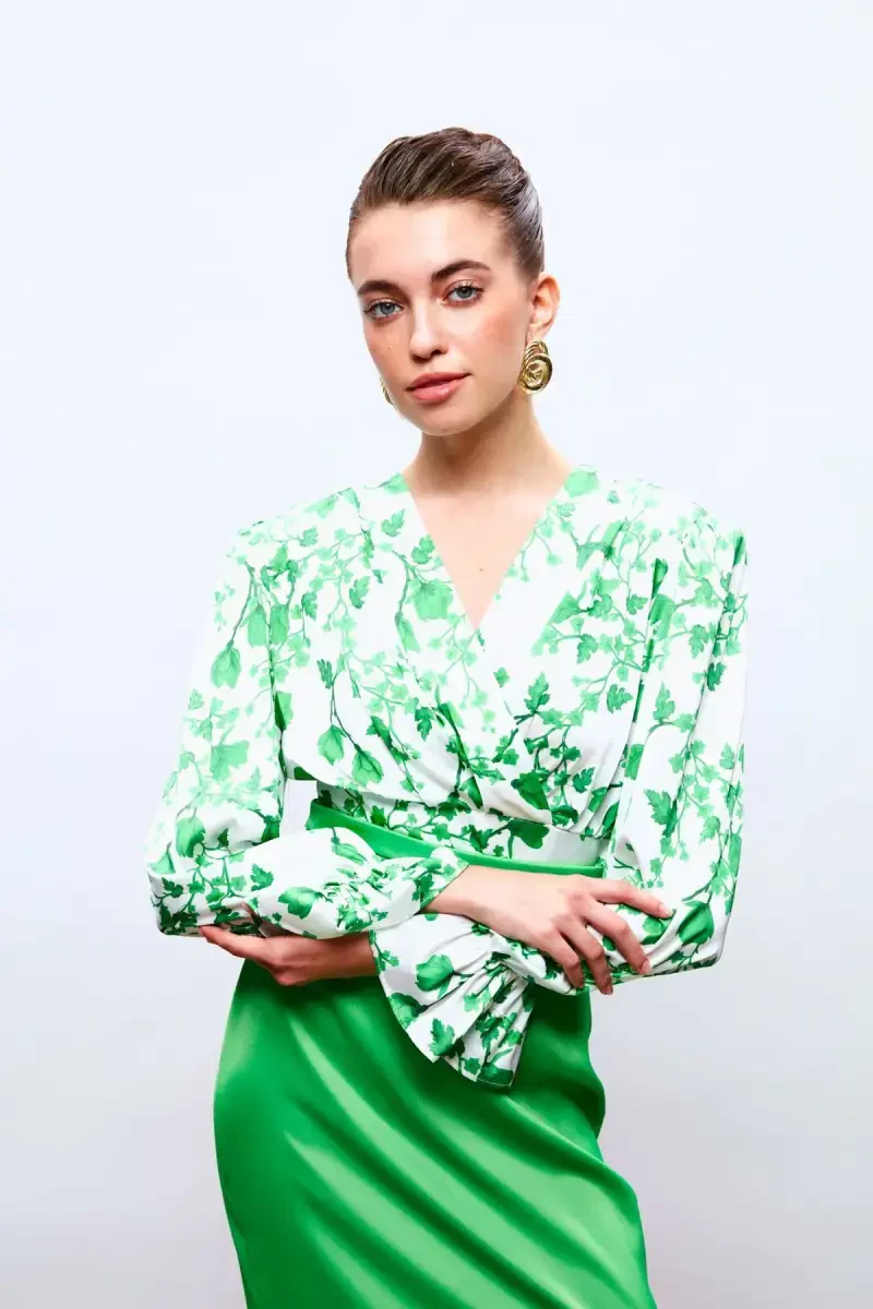 saten bluzka, ruffled bluzka, ayollar uchun bluzka, yashil bluzka, zamonaviy bluzka, nozik bluzka, kundalik bluzka, maxsus kunlar uchun bluzka, ayollar kiyimi, moda