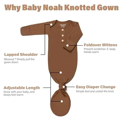 Combining ultimate comfort and elegance for your baby, the Newborn Baby Knotted Gown is the perfect sleepwear for newborns. Made from super soft and silky Modal fabric, this gown gently touches your baby's delicate skin and offers a comfortable sleep experience. The knot at the bottom makes diaper changes incredibly easy. Just untie the knot, change, and tie again! No need to deal with buttons, zippers, or complicated ties. This feature makes it an ideal sleepwear for both baby girls and boys. Fold-over mittens prevent your baby from scratching themselves. You can easily cover their hands by folding the mittens. The Newborn Baby Knotted Gown is not just sleepwear, but also a perfect coming home outfit. It comes with a matching hat, silicone pacifier clip, and a bow headband, ensuring a great look for your baby's first photos. The long-sleeved design keeps your baby's tummy and hands warm. Its extra length makes knotting easy and grows with your baby. These features make it a great baby shower gift for newborns. Looking great in photo shoots, this gown provides both elegance and comfort for your baby. The blend of 95% Modal and 5% Spandex, suitable for your baby's sensitive skin, offers softness and flexibility. The knotted design allows your baby to move freely while staying warm. The ease of diaper changing makes life easier for parents. With its stylish design and practical features, the Newborn Baby Knotted Gown is a perfect choice for your baby.