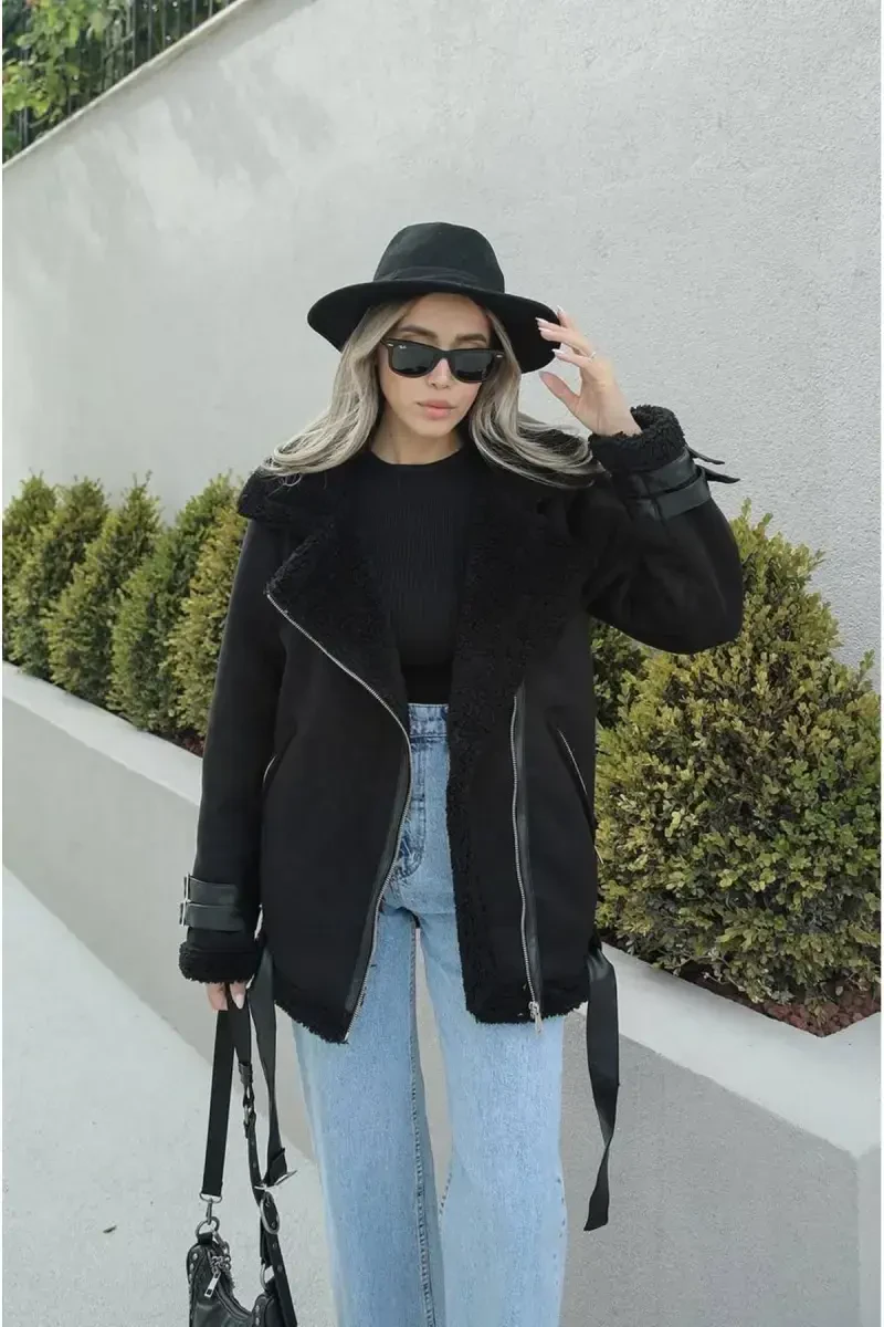 Discover a stylish and practical piece that will become a staple in your wardrobe with the New Season Women's Inside Rapid Belt Detailed Zr Leather Suede Jacket. This jacket is offered with the quality of MY BELLA BUTİK and is designed to meet the style needs of the modern woman. Its classic and timeless plain pattern, which easily adapts to any environment, always keeps your elegance in the foreground. The biker silhouette ensures that the jacket has a modern and dynamic look, making it ideal for daily use. Whether you're taking a coffee break in the city or going out for dinner, this jacket will accompany you and complete your style.The regular fit offers a comfortable wearing experience while perfectly fitting your body lines. In this way, you will look both stylish and will not compromise on your comfort throughout the day. Zipper details support the practical use of the jacket, while the jacket collar design adds a sophisticated touch. Thanks to the versatility of the jacket, you can maintain your elegance at every moment from day to night.The double-pocket design allows you to safely carry small items such as your keys, phone or wallet. The belt detail gently wraps around your waist, creating a feminine silhouette, so you always look stunning. The woven fabric type increases the durability of the jacket and offers long-term use. The 100% polyester material component ensures that the jacket has the advantage of easy maintenance. It maintains its shape and offers ease of use with its stain-resistant properties. Its belted structure emphasizes your waist and highlights your feminine lines. This jacket is a perfect choice for women who want both style and practicality together.
