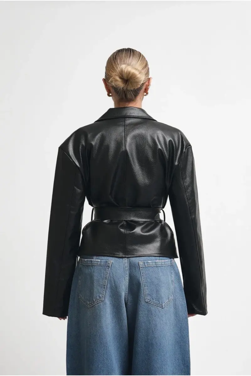 Yeni Sezon Kruvaze Kuşaklı Düğmeli Deri Ceket-Siyah&Black
