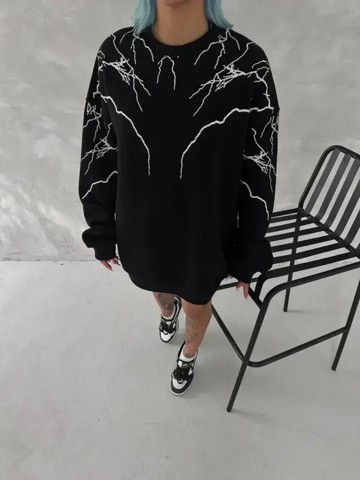 Yıldırım Baskılı Bisiklet Yaka SweatShirt - SiyaModazoneodelin Ölçüleri: Boy: 165, Kg: 55, Göğüs: 90, Bel: 72, Kalça: 100Modelin üzerindeki ürün M/38 bedendir