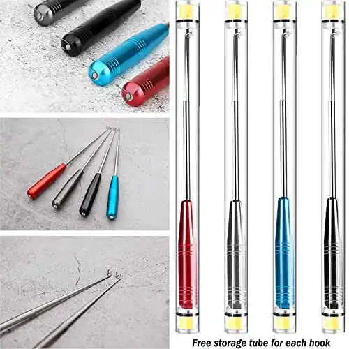🐟UPGRADED FISH HOOK REMOVER: Non-Slip sturdy handle with anodized surface treatment, 4 different color bright and beautiful. Made of stainless steel, the surface is comfortable grip and not easy to fade or rust. Light in weight, serviceable and reliable. Suitable for freshwater or saltwater. 🐟Spiral Extractor Design: The fishing hook disgorger kit can quick removing the hook from 360 degrees. The humanized design simplifies the hook removal steps, saves the hook time, protects your hands and reduce damage to fish. It's ring mouth is adjustable in size.Equipment suitable for fishing lines and eagle claw fishing hooks of different large or thicknesses. 🐟Each storage tube packing: 4PCS fishing pliers hook removers length is 6.8 inches, the weight is 0.88 oz. with ergonomic to enhance hand strength and reduce fatigue. Storage tube can be conveniently placed in your small backpack is easy to carry and storage, ready to serve you for a long time and good gifts for fishing lovers. 🐟Strong Magnetic Bottom: The bottom of the fishing hook setter tool adopts a strong magnetic design, which can quickly absorb the hook and also help you quickly find the hook accessoies you want from the fishing equipment. Saving you a lot of time and energy. 🐟 How To Use: 1.Assemble the equipment part; 2.Place the release loop on the descending device's fishing coil line; 3. Slide the hook and along the line can easy to find and quickly release the hook.