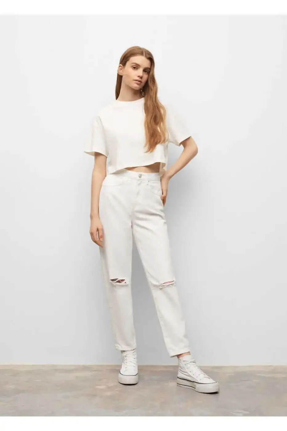 Düz kesim jean, yırtık detaylı jean, yüksek bel jean, zamansız şıklık, dokuma kumaş