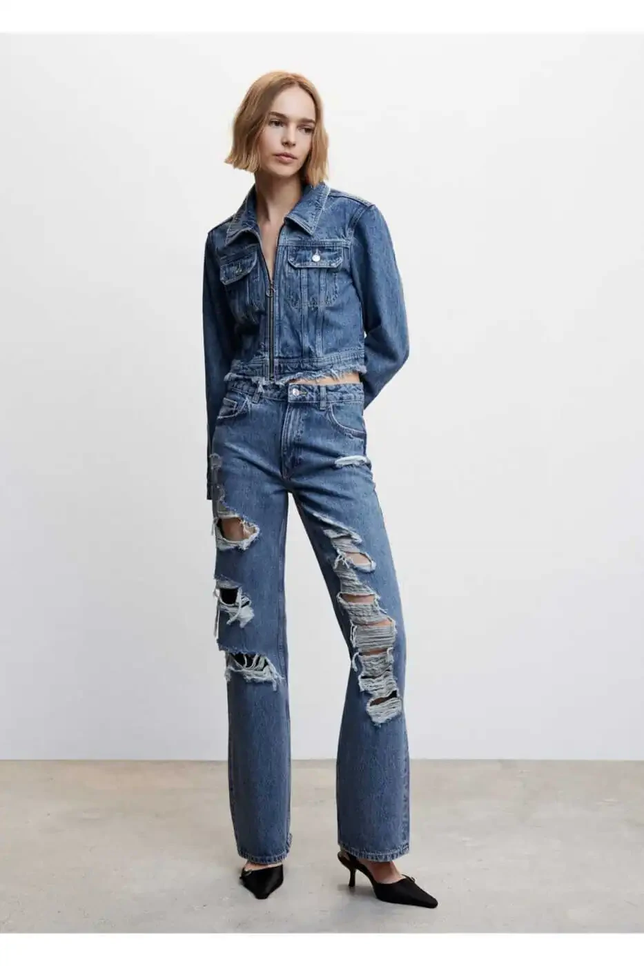 **Distressed High-Waisted Straight Leg Jeans****Product Description:**Elevate your wardrobe with these stylish Distressed High-Waisted Straight Leg Jeans. Boasting a high-rise design and distressed detailing, they offer both comfort and eye-catching style.**Features:*** **Material:** 80% cotton, 20% recycled cotton* **Fit:** Straight leg* **Length:** Long* **Waist:** High-waisted* **Details:** Distressed, zipper and button closure, five pockets, belt loops* **Inseam:** 32.8 in (83.4 cm)* **Outseam:** 45.4 in (115.2 cm)* **Care Instructions:** * MACHINE WASH COLD, GENTLE CYCLE * DO NOT BLEACH * IRON LOW * DO NOT DRY CLEAN * DO NOT TUMBLE DRY**Sale Details:*** **Seller:** Trendyol* **Stock:** Less than 5 items* **Sale Price:** Yes* **Order Limit:** 10 items* **Return Policy:** Free returns within 15 days