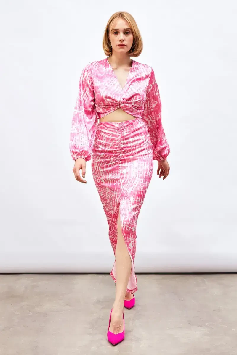 Yirtiq Deталlı Naqshli Uzun Yubkani oddiy futbolkalar, bluzkalar, crop toplari va zamonaviy ko'ylaklar bilan birlashtirib, zamonaviy ko'rinishga erishishingiz mumkin. To'piq poyabzallingiz bilan to'ldirganingizda, kechki tadbirlar uchun ham tanlashingiz mumkin.