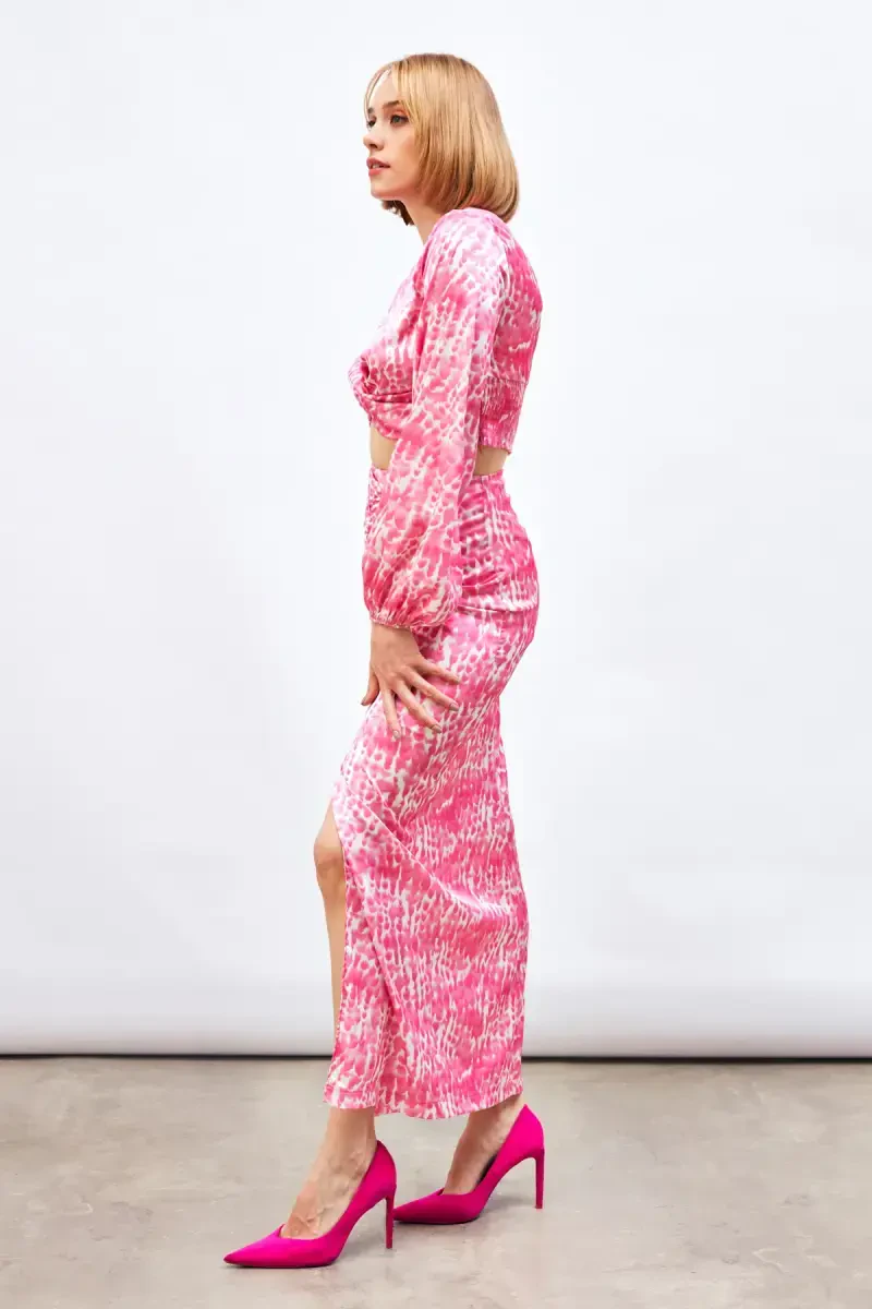 Yirtiq Deталlı Naqshli Uzun Yubkani o'zingizning uslubingizni aks ettiruvchi turli aksessuarlar bilan to'ldirishingiz mumkin. Kumush yoki oltin rangli marjon, ingichka kamar va zamonaviy sumka kombinatsiyangizni to'ldiradi.