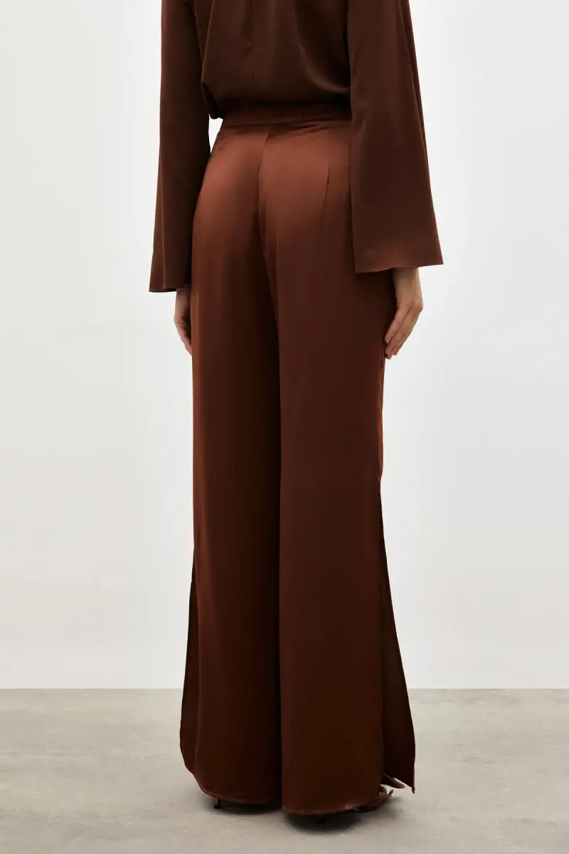 Yırtmaç Detaylı Saten Pantolon - Kahve, şıklığı ve rahatlığı bir araya getiren özel bir tasarımdır. Sateen kalitesiyle sunulan bu pantolon, saten kumaşın zarif dokusu ve modern kesimi ile gardırobunuzun vazgeçilmezi olacak. Yüksek bel tasarımı, vücut hatlarınızı kusursuz bir şekilde ortaya çıkarırken, yandan fermuarlı kapama pratik bir kullanım sunar. Pantolonun en dikkat çekici özelliği ise yırtmaç detaylarıdır. Bu detaylar, pantolona hareket ve özgünlük katarken, şıklığınızı bir adım öne taşır. İster özel bir davette, ister günlük kullanımda, bu pantolon ile her zaman stil sahibi görünebilirsiniz. Kahve renginin sıcak tonu, farklı kombinler yapmanıza olanak tanır. Topuklu ayakkabılarla şık bir kombin oluşturabilir, spor ayakkabılarla daha rahat bir görünüm elde edebilirsiniz. Sateen'in özenli işçiliği ve kaliteli malzeme seçimi sayesinde uzun ömürlü bir kullanım sunar. Bu pantolon, sadece şık değil, aynı zamanda konforlu bir seçenektir. Saten kumaşın yumuşak dokusu, gün boyu rahat etmenizi sağlar. Gardırobunuzda mutlaka bulunması gereken bu özel pantolon, stilinizi tamamlayacak ve her ortamda dikkat çekmenizi sağlayacaktır. Yırtmaç Detaylı Saten Pantolon - Kahve, modern kadının stilini yansıtan, şık ve özgün bir seçenektir. Her kombininize farklı bir hava katacak bu pantolonu çok seveceksiniz. Unutmayın, şıklık detaylarda gizlidir ve bu pantolon, detaylarıyla fark yaratmanızı sağlar.