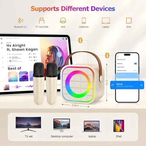 PERFECT GIFTS IDEAS FOR KIDS ADULTS: If you're looking for the fun music gift for boys girls, Our mini karaoke machine is a great choice. Beautiful color design and exquisite gift box make it an ideal gift for kids and teens, perfect birthday Christmas gift for 3,4, 5, 6, 7, 8, 9, 10, 11, and 12+ year old toddlers teens adults.Perfect gift choice for all kinds of festival - Christmas, Valentine, Halloween, Thanksgiving, New Year 4 COLORFUL LIGHTING MODES & DOUBLE LAYER APERTURE: When you playing and singing music, you can press light icon on top button to show which there are 4 different lighting modes and the last no light mode you can choose. The Karaoke machine features dazzling and colorful double light aperture effect, creating an immersive and dynamic karaoke experience. Perfect for adding excitement and vitality to any party, keeping your family friends kids immersed in home KTV joy throughout the night LOUD, CLEAR SOUND: The portable karaoke machine equipped with HI-FI sound quality, a bass diaphragm and digital signal processor to deliver powerful, clear and loud sound, with stronger bass and more moderate volume. Excellent audio immersive experience, perfect for adults and kids listen music/book.Note: microphone too close to the Speaker will produce a harsh sound is normal, please try to keep the microphone away from the speaker to avoid BLUETOOTH 5.1 & EASY CONNECTION: Bluetooth 5.1 technology connectivity easily connects to your TV, phone, tablet, PC, or laptop which allows You can use YouTube, Apple Music and other singing apps to play karaoke sound sources. With accompany function, enabling children to enjoy their pure and crystal-clear music and singing. Mini karaoke machine can also play MP3 music files by inserting a TF card or USB stick DOUBLE MICROPHONE, FUNNY VOICE CHANGE: The Mini karaoke machine comes with 2 wireless microphones, you can sing your hits, a duet with a partner. features fun voice changer function, ,including monster, baby voices, male. This adds more enjoyment to your family gatherings party. This kids karaoke machine has a built-in rechargeable battery that provides up to 5-10 hours of playback. Package List: 1 mini bluetooth speaker, 2 mics, 2 usb cables, 1 user manual