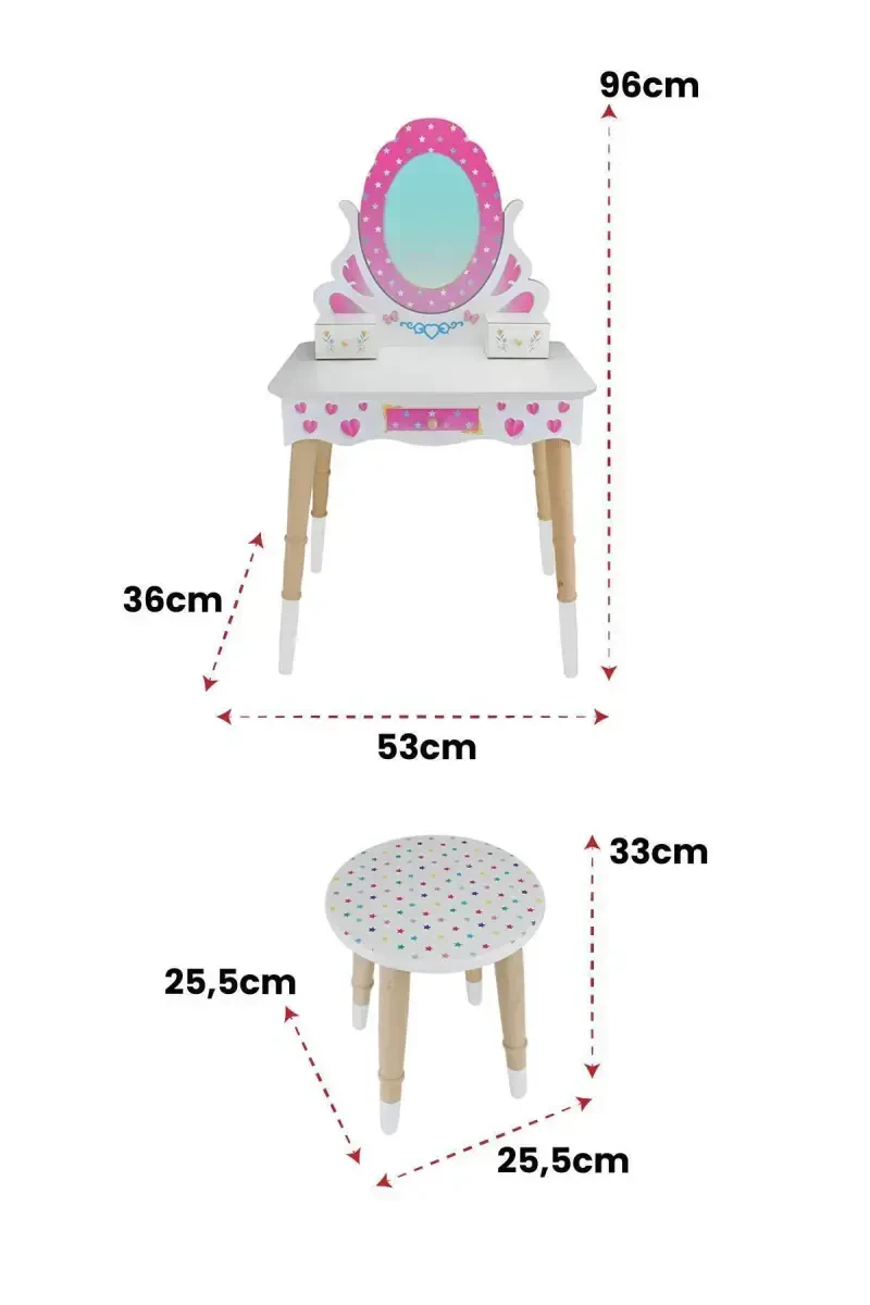 Bolalar ushbu yoqimli kiyim stolida sochlarini tarashadi, bo'yanishlari va do'stlari bilan o'ynashlari mumkin. Setning kichik tortmasi bo'yanish vositalarini, soch cho'tkasini va boshqa mayda narsalarni tartibda saqlash uchun juda mos keladi. Mustahkam va bardoshli yog'och materialidan tayyorlangani sababli u ko'p yillar davomida ishlatilishi mumkin.