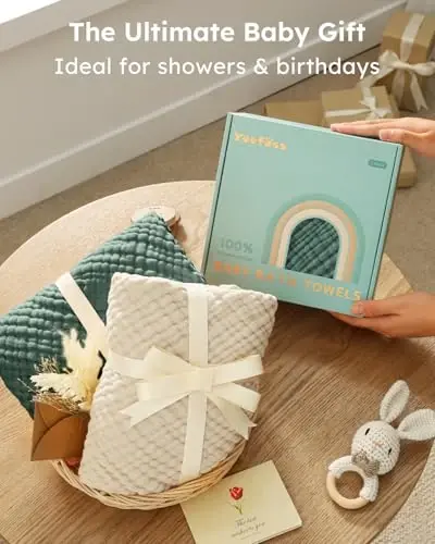 [Soft and Absorbent] - 100% high quality muslin organic cotton, the best fabric for babies, makes the baby bath towel super soft than regular cotton towel. It absorbs the water off baby quickly and keeps baby warm after baths. [Excellent Durability] - The 6 layers thickness muslin design is long-lasting enough for everyday use. Sized in 32 x 32 inches, the hooded baby towels are suitable for newborns, infants, toddlers, and small kids up to 3 years old. [Easy Care] - Our muslin baby towels with hood will keep its softness, thickness and color even after many washes, machine washable and quick dry. The set of 2 baby towels for newborn is more convenient for daily change and easy clean up. [Versatile Usage] - Not only used as baby bath towel, it can also be used as baby blanket, swaddling, changing mat cover. Wrap your little one in this soft baby hooded towel after bathing him in a tub, at the pool or beach. [Perfect Baby Gift] - As a lovely and practical baby essential, our hooded baby towels for boys and girls is a perfect unisex baby shower gift, or baby registry gift!