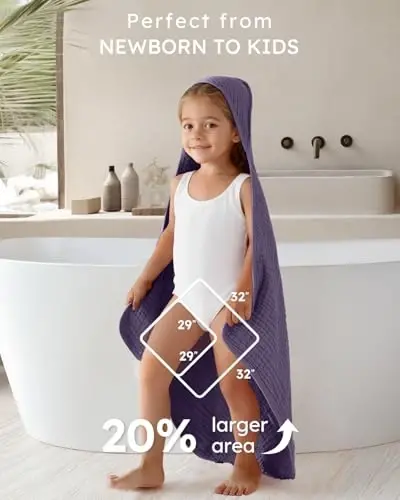[Soft and Absorbent] - 100% high quality muslin organic cotton, the best fabric for babies, makes the baby bath towel super soft than regular cotton towel. It absorbs the water off baby quickly and keeps baby warm after baths. [Excellent Durability] - The 6 layers thickness muslin design is long-lasting enough for everyday use. Sized in 32 x 32 inches, the hooded baby towels are suitable for newborns, infants, toddlers, and small kids up to 3 years old. [Easy Care] - Our muslin baby towels with hood will keep its softness, thickness and color even after many washes, machine washable and quick dry. The set of 2 baby towels for newborn is more convenient for daily change and easy clean up. [Versatile Usage] - Not only used as baby bath towel, it can also be used as baby blanket, swaddling, changing mat cover. Wrap your little one in this soft baby hooded towel after bathing him in a tub, at the pool or beach. [Perfect Baby Gift] - As a lovely and practical baby essential, our hooded baby towels for boys and girls is a perfect unisex baby shower gift, or baby registry gift!